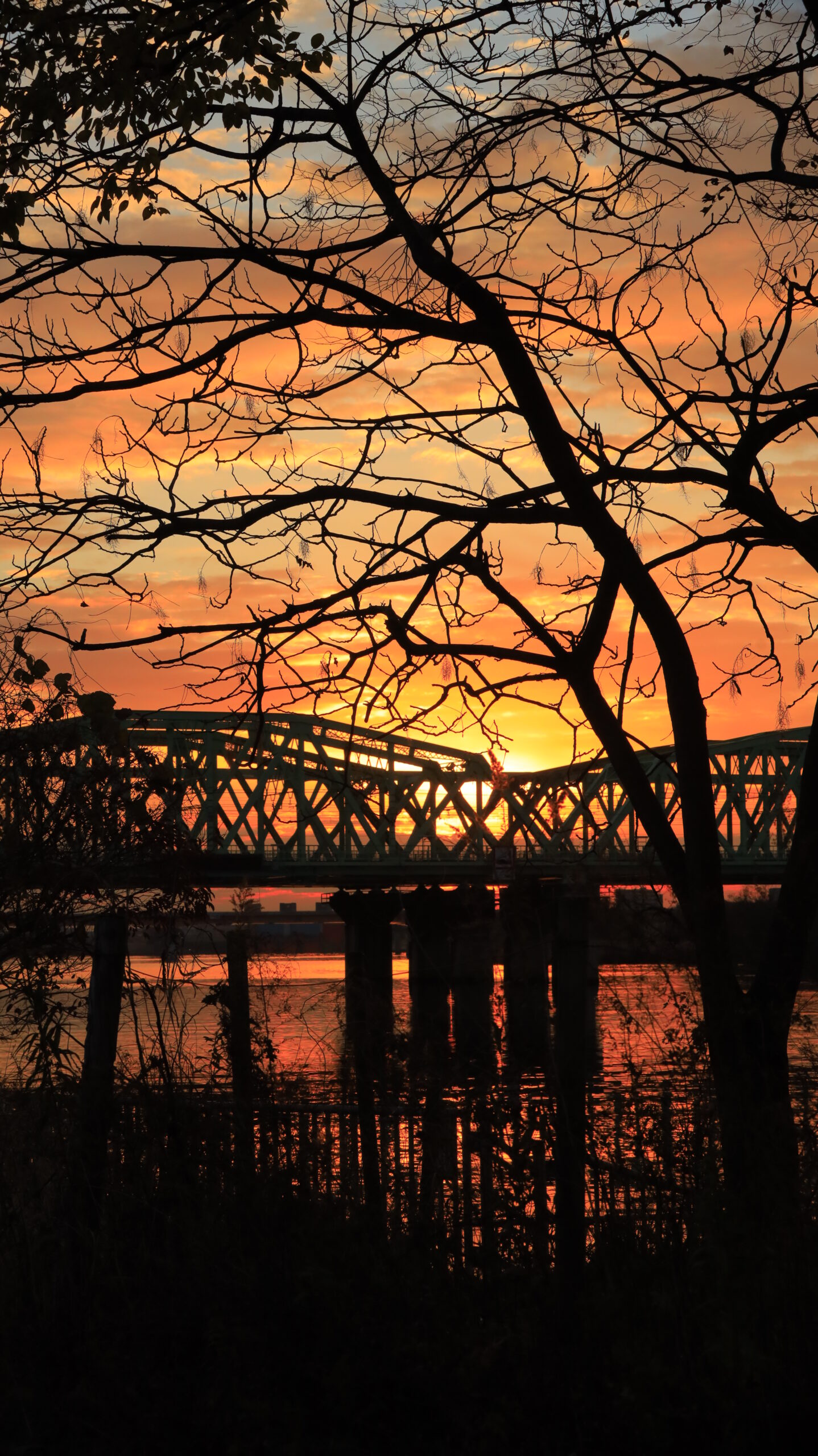 この写真は、荒川土手で朝焼けのタイミングに、橋と木々のシルエットが空に映える様子を意識して撮影した一枚です。
