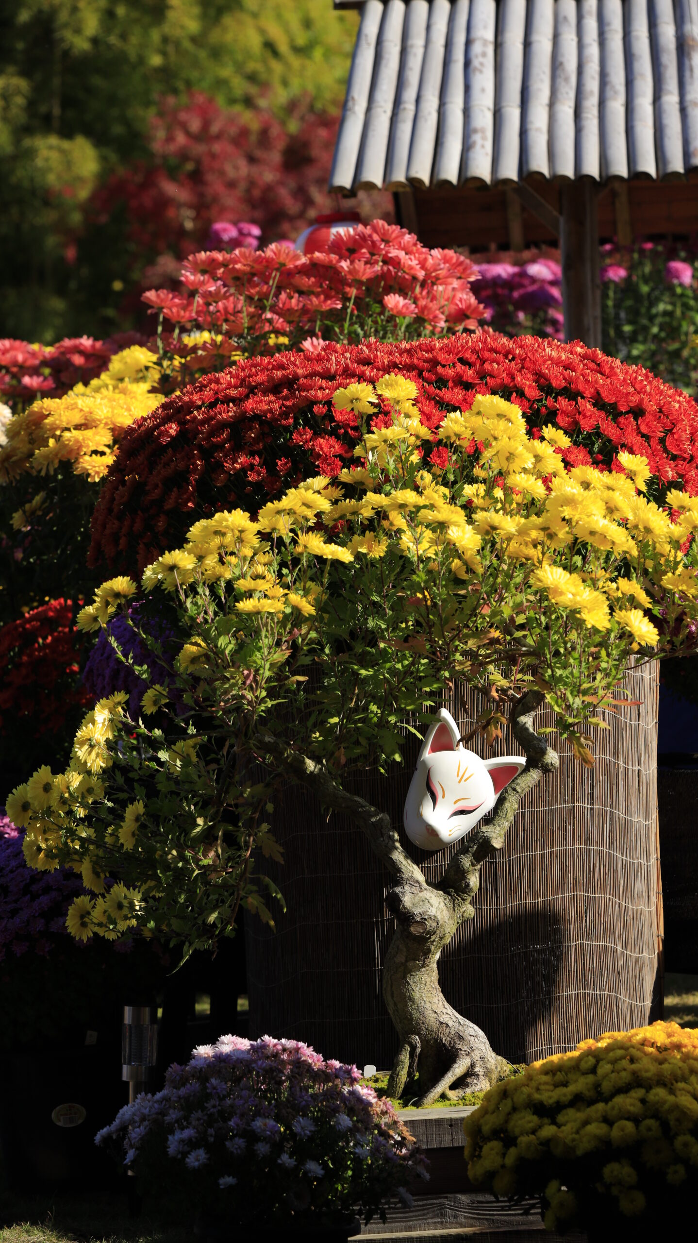 この写真は、かさま歴史交流館井筒屋で、入口付近に飾られた菊の花のディスプレイと可愛い狐のお面を撮影したものです。伝統と遊び心が共存した魅力的な展示が印象的です。
