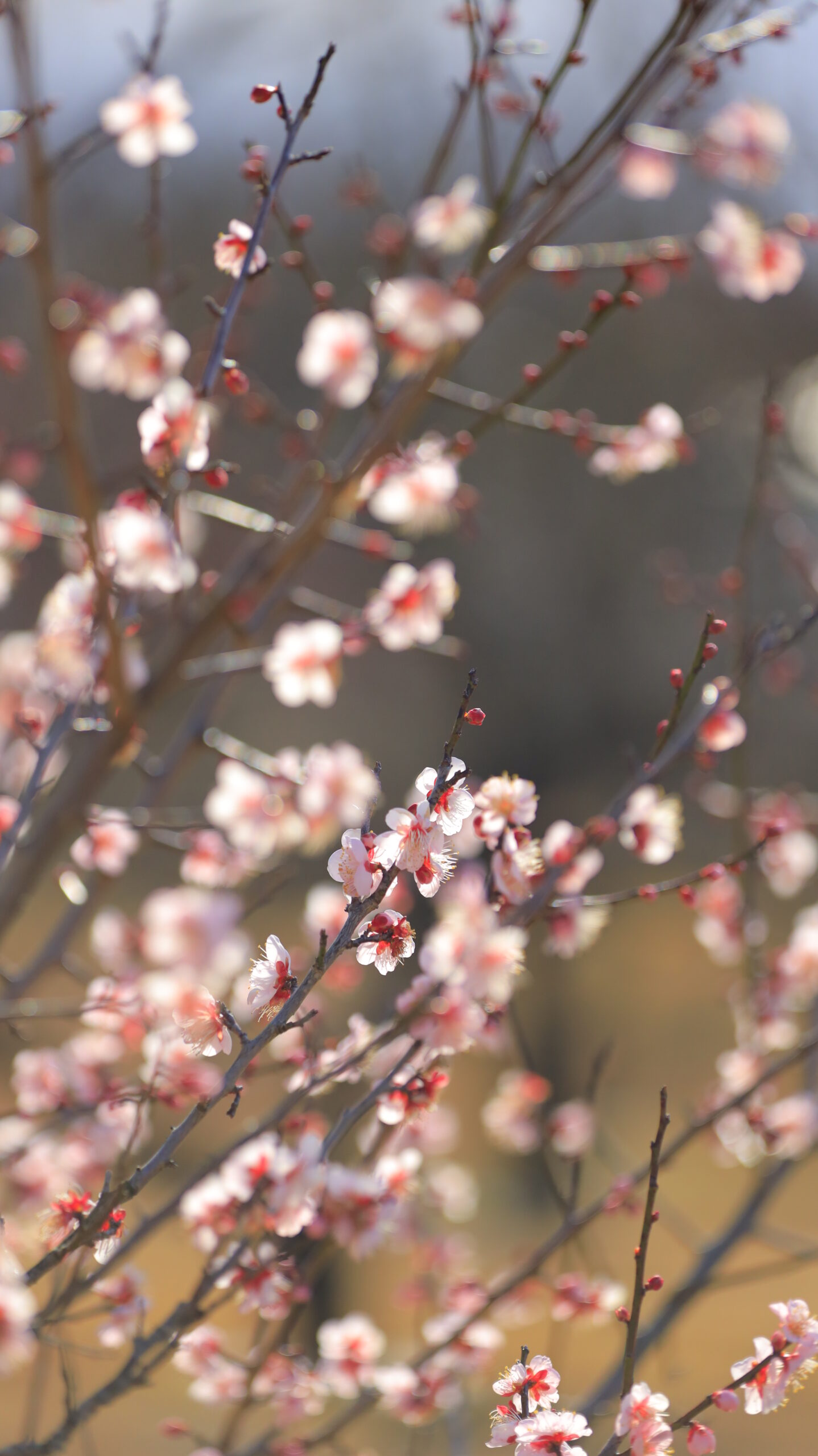 この写真は、小田原フラワーガーデンで、梅の花が咲き誇る園内の雰囲気が伝わるように撮影しました。