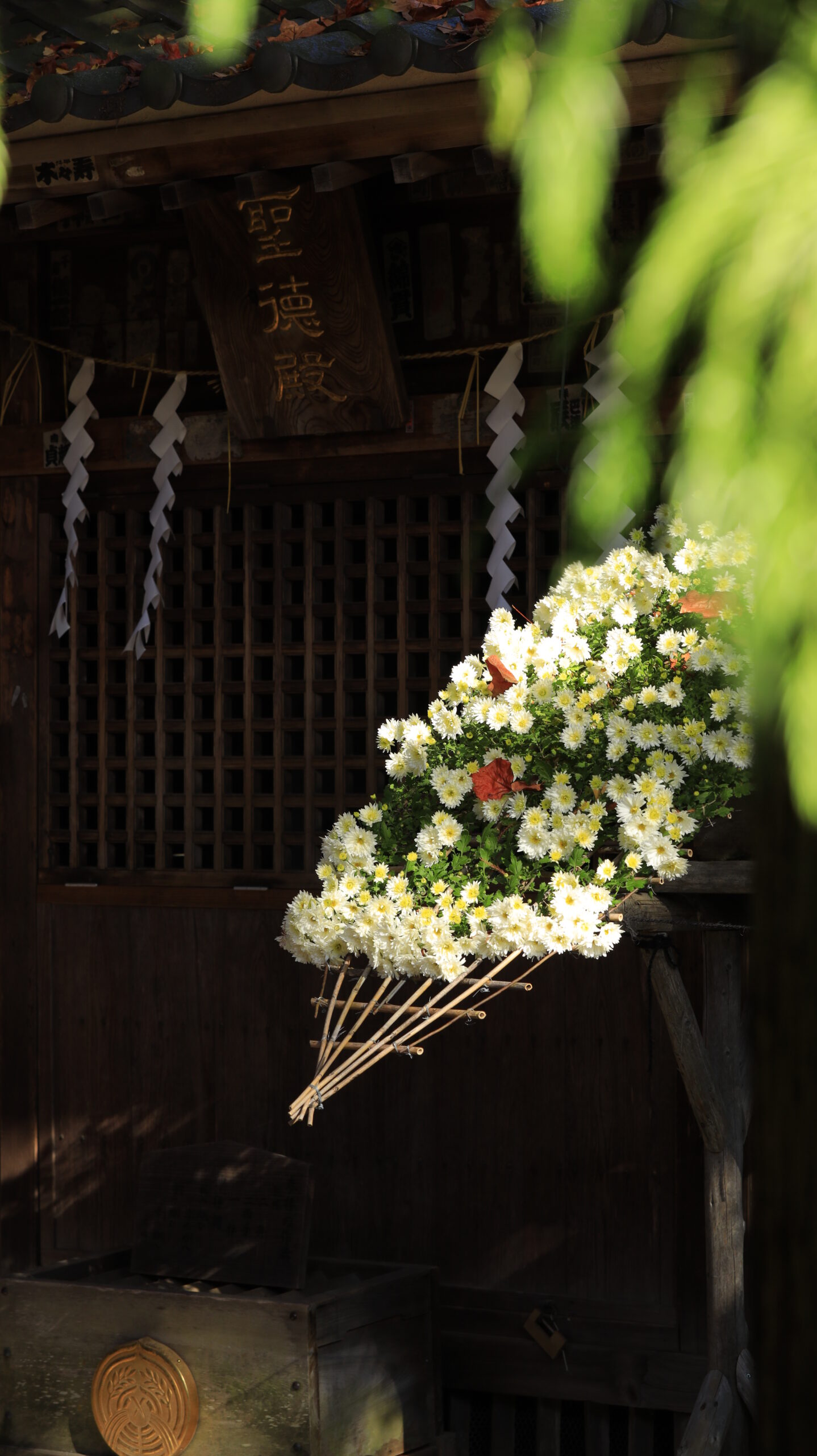 この写真は、笠間稲荷神社で、菊の花に柔らかな光が当たって輝く様子を撮影したものです。光が花びらを透かし、秋の穏やかさを感じさせる一枚です。