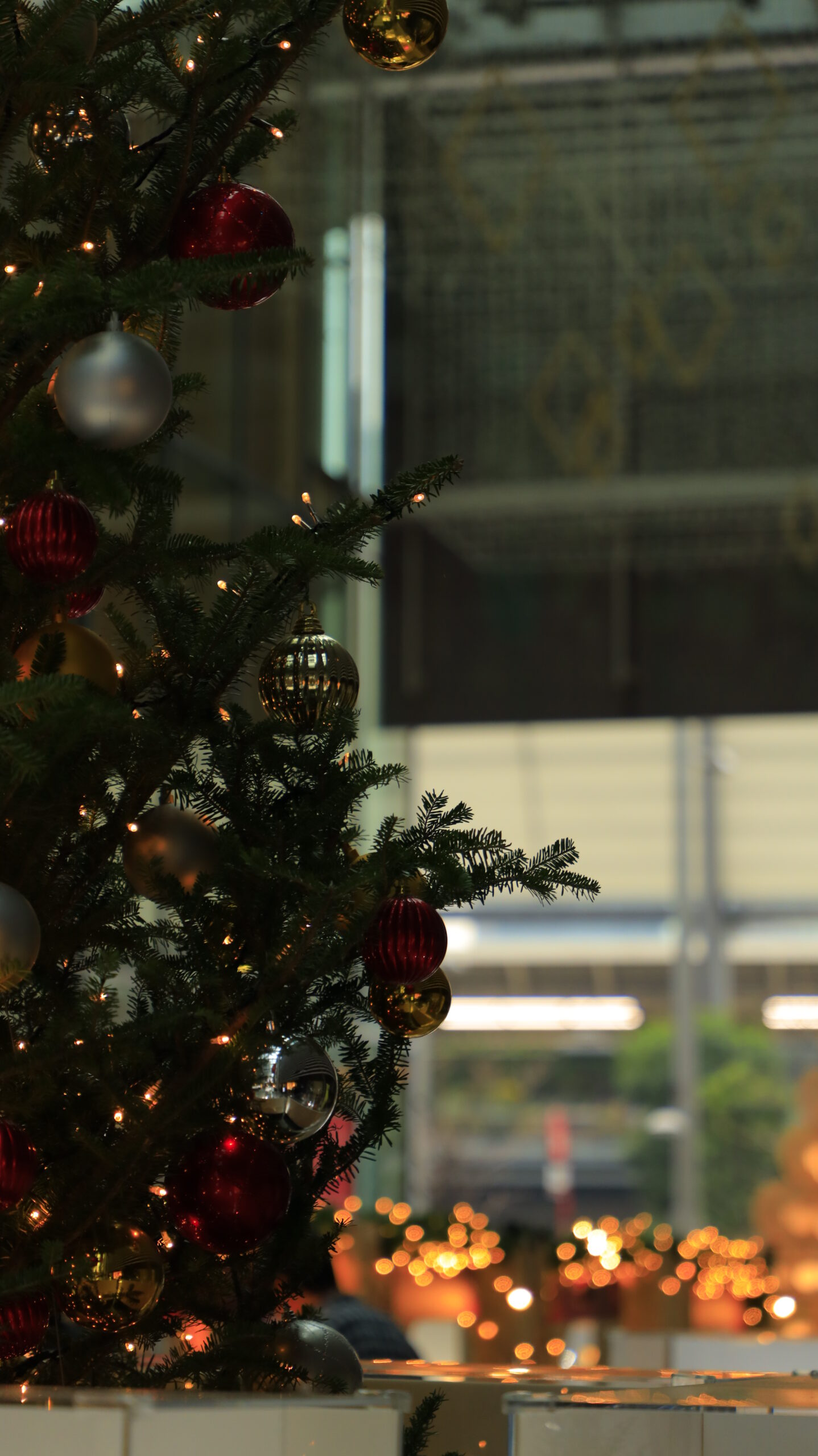 この写真は、東京ミッドタウン八重洲で、クリスマスツリーや装飾が並ぶ華やかなディスプレー全体の雰囲気を捉えた写真です。