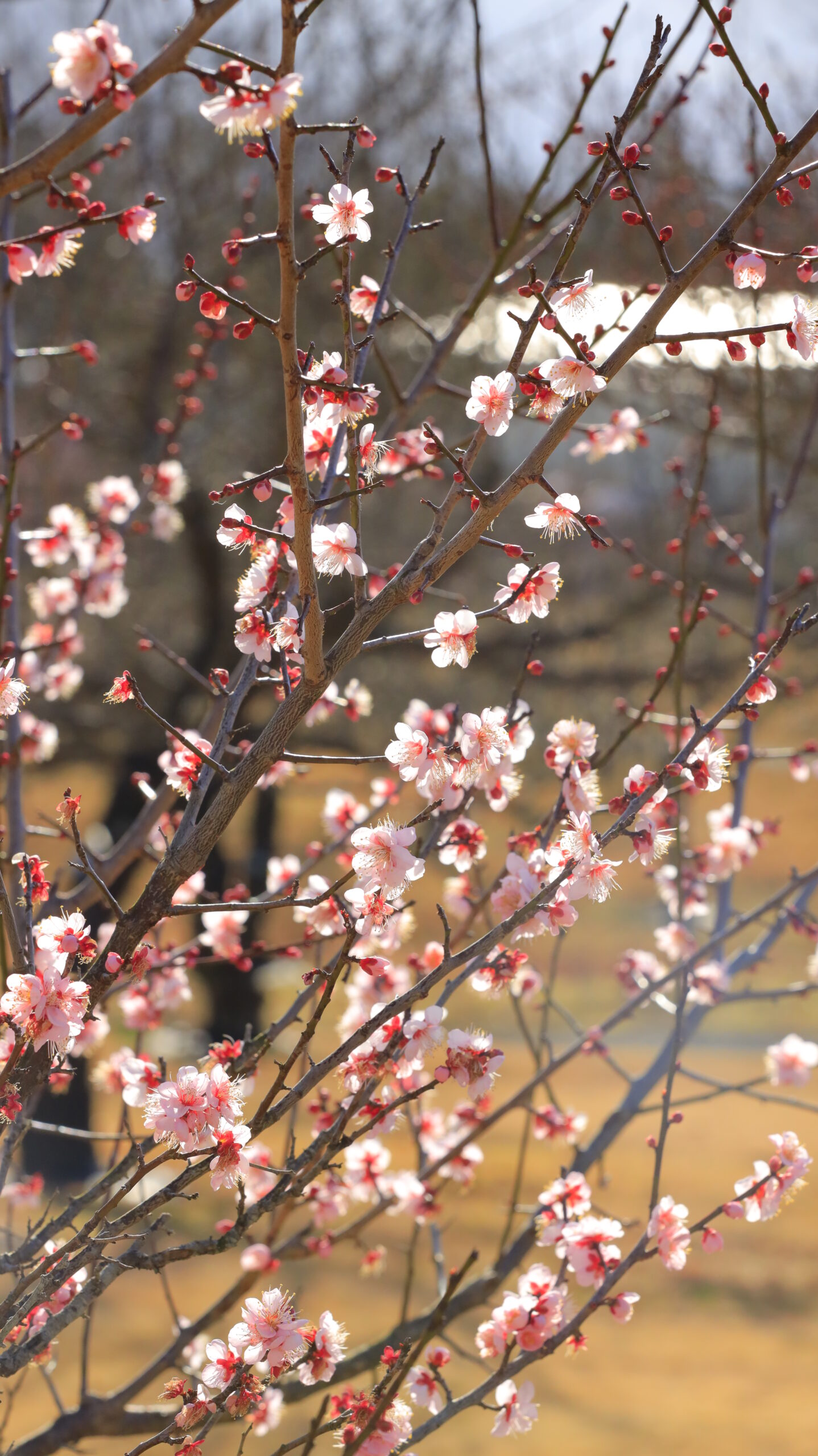 この写真は、小田原フラワーガーデンで、木から少し離れた位置から梅の花の枝を撮影しました。