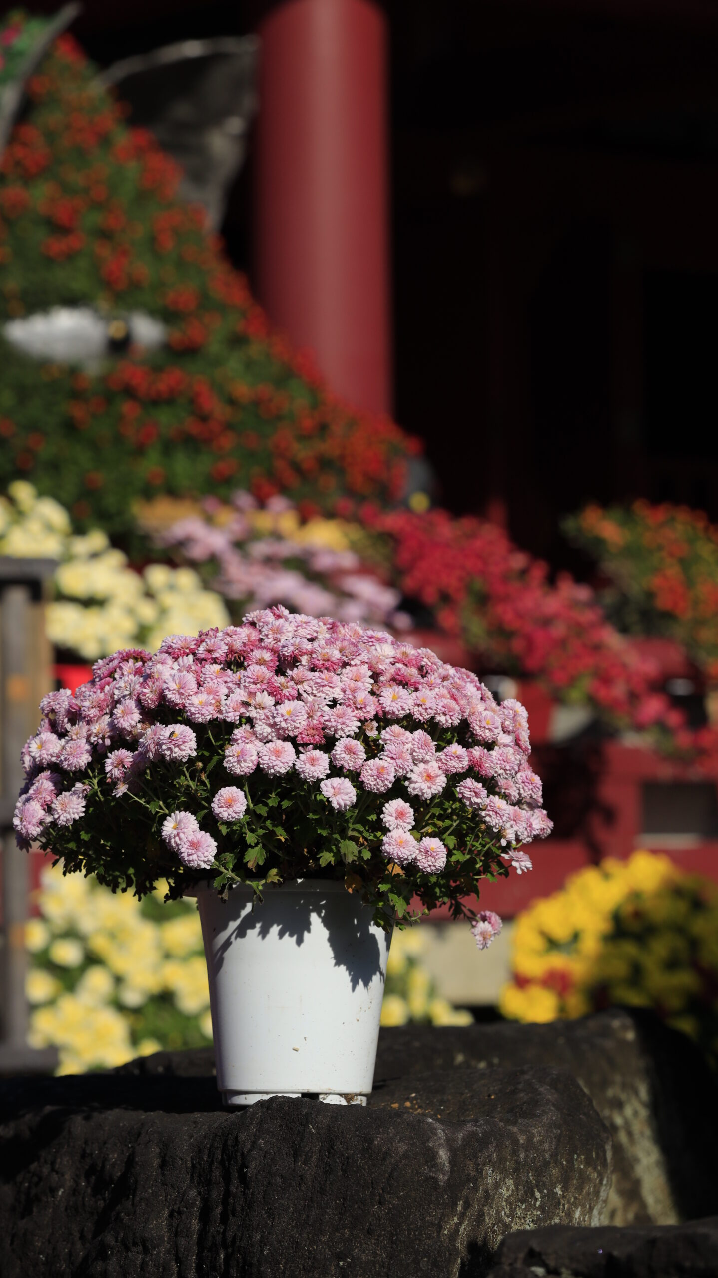 笠間稲荷神社で、丁寧に整えられた鉢植えの菊の花を撮影した写真。花の美しさと手入れの良さが伝わる。