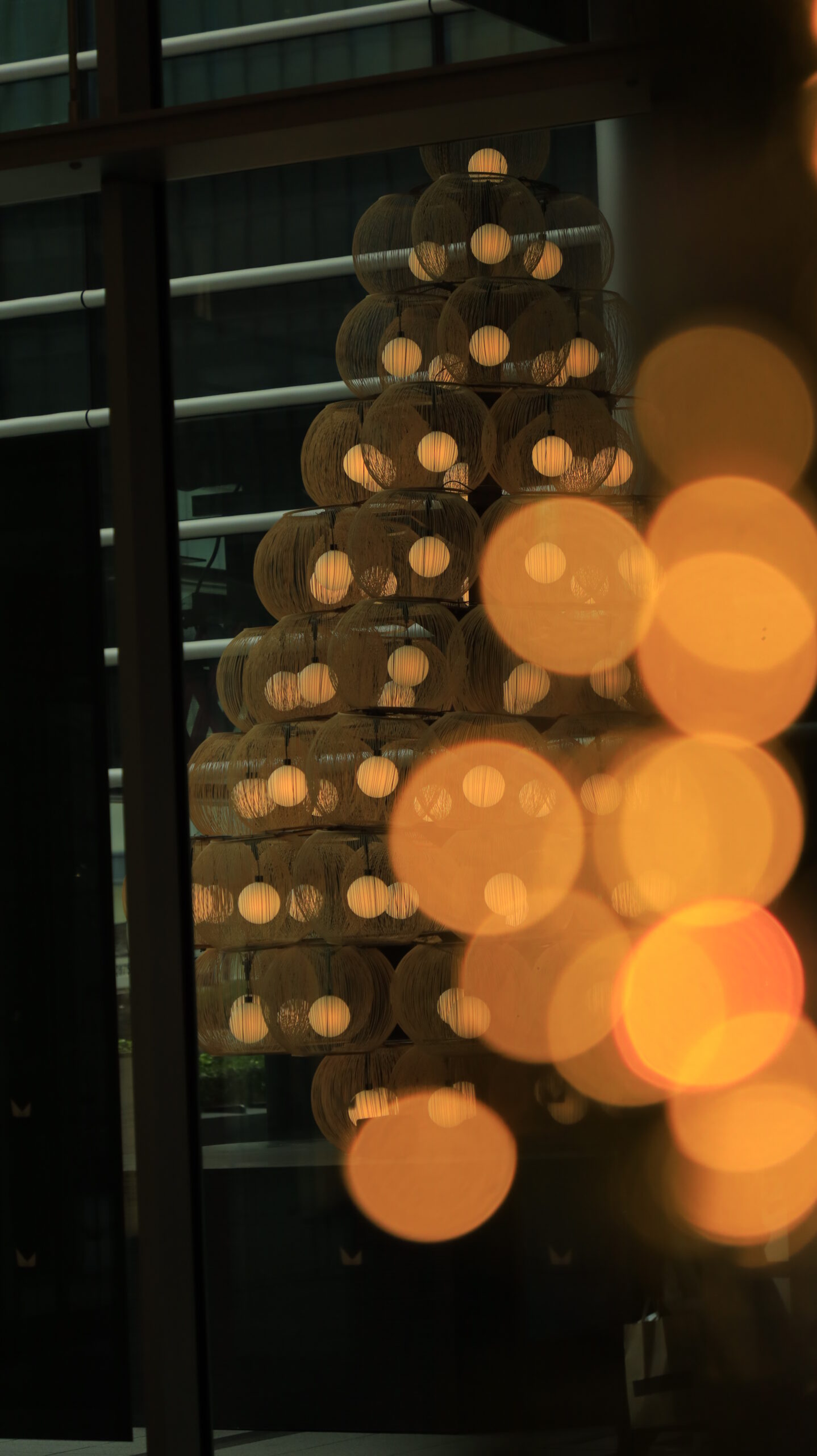この写真は、東京ミッドタウン八重洲で、駿河竹千筋細工のクリスマスツリーを室内の明かり越しに撮影し、奥行きと柔らかさを表現した一枚です。
