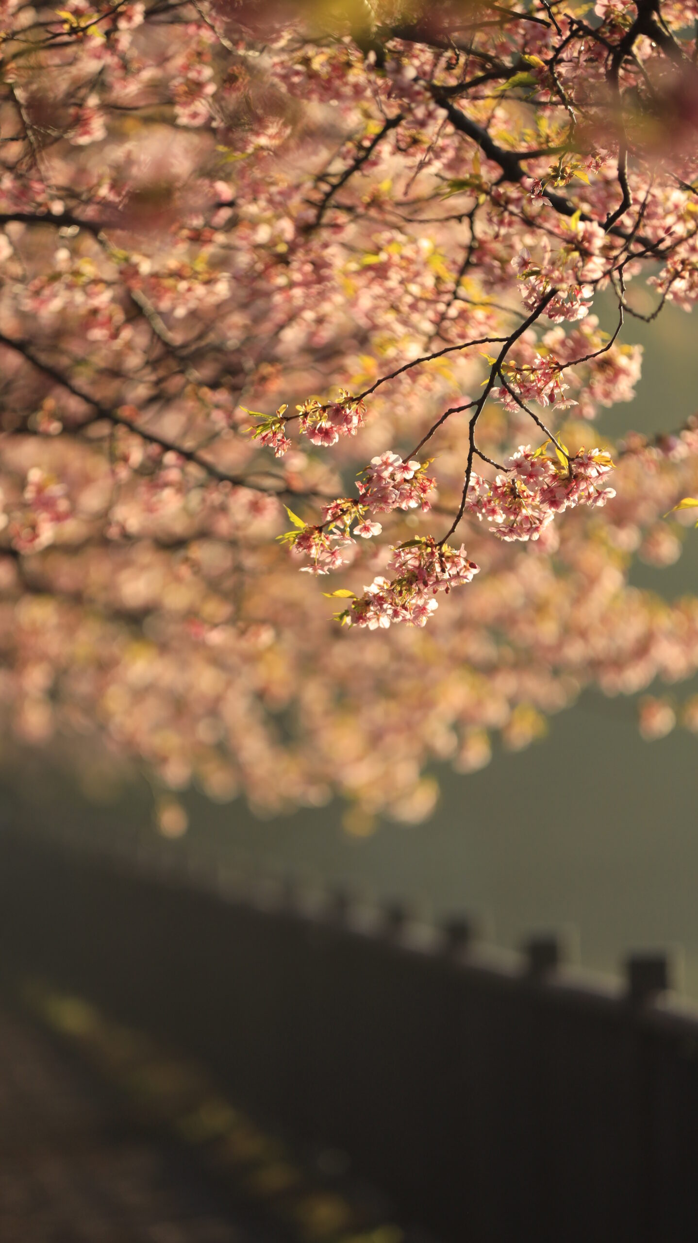 三浦海岸桜まつりで、一房の桜の枝に注目し光に当たる様子をクローズアップで撮影。繊細な花びらの質感を強調。