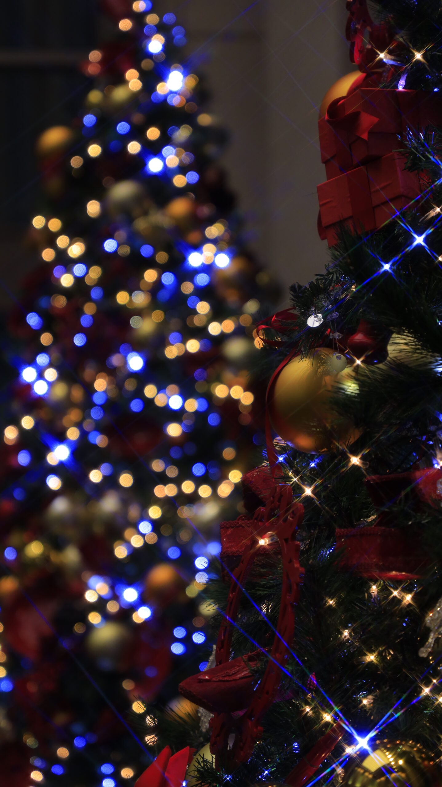 この写真は、コレド室町テラスで、フィルターを使用して光のきらめきを強調し、華やかさを増したクリスマスツリーを撮影したものです。