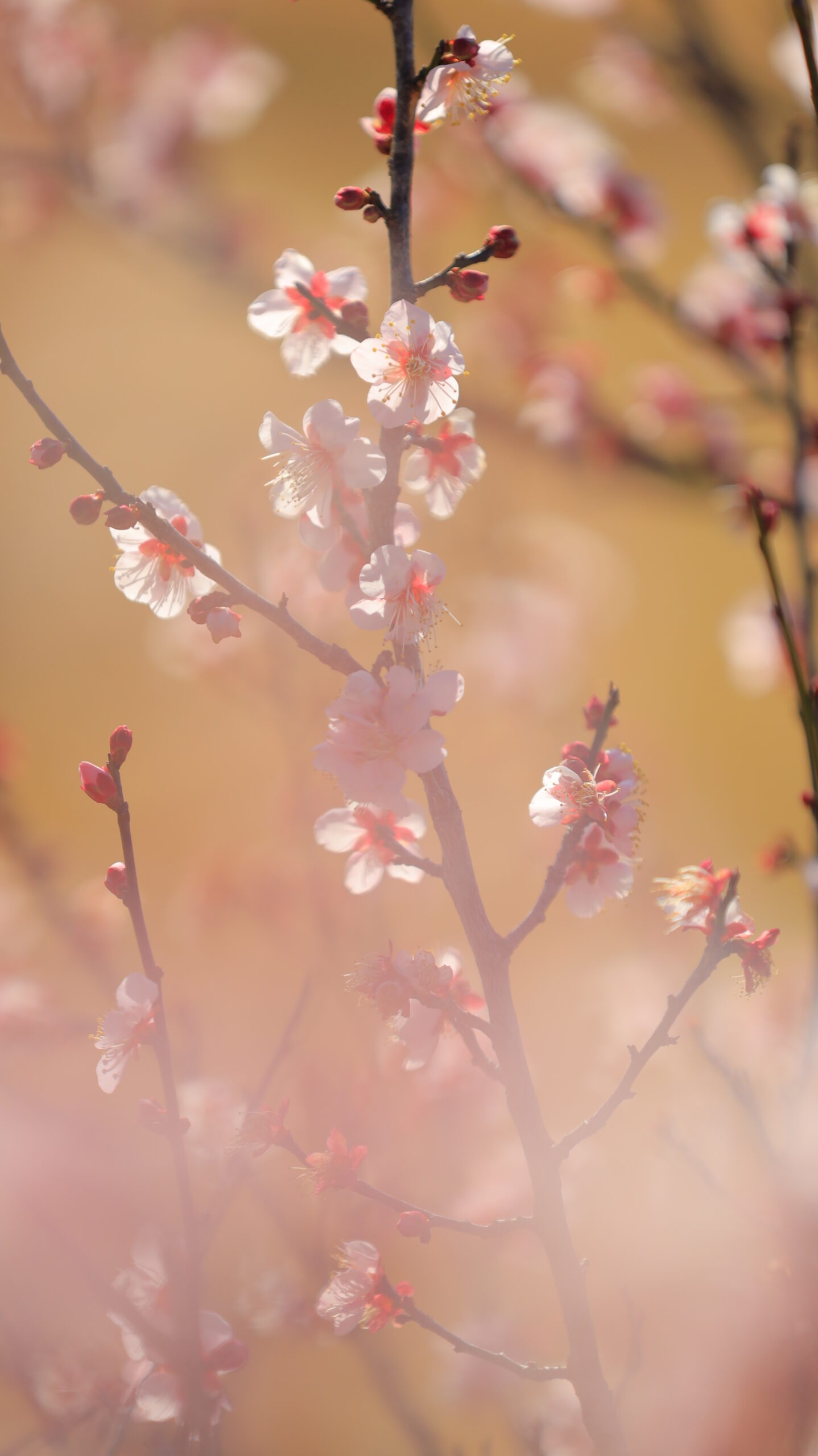この写真は、小田原フラワーガーデンで、手前を大きくぼかし、奥に続く梅の花の枝を撮影したものです。