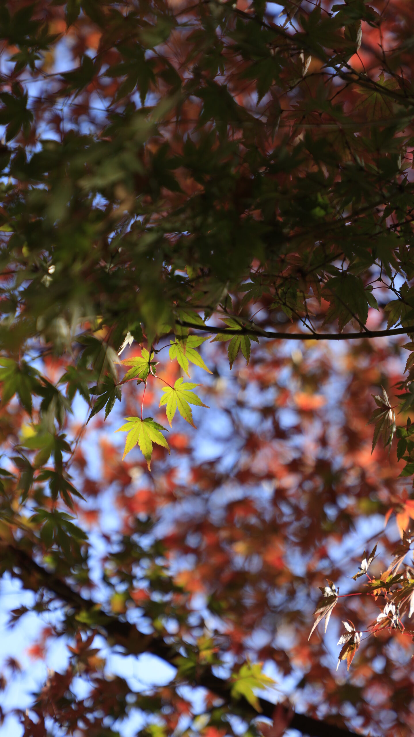 この写真は、町田薬師池公園で、真っ赤なモミジを背景に、手前の緑のモミジを下から光を意識して撮影したものです。色の対比と光の演出が際立ち、立体感のある美しい構図です。
