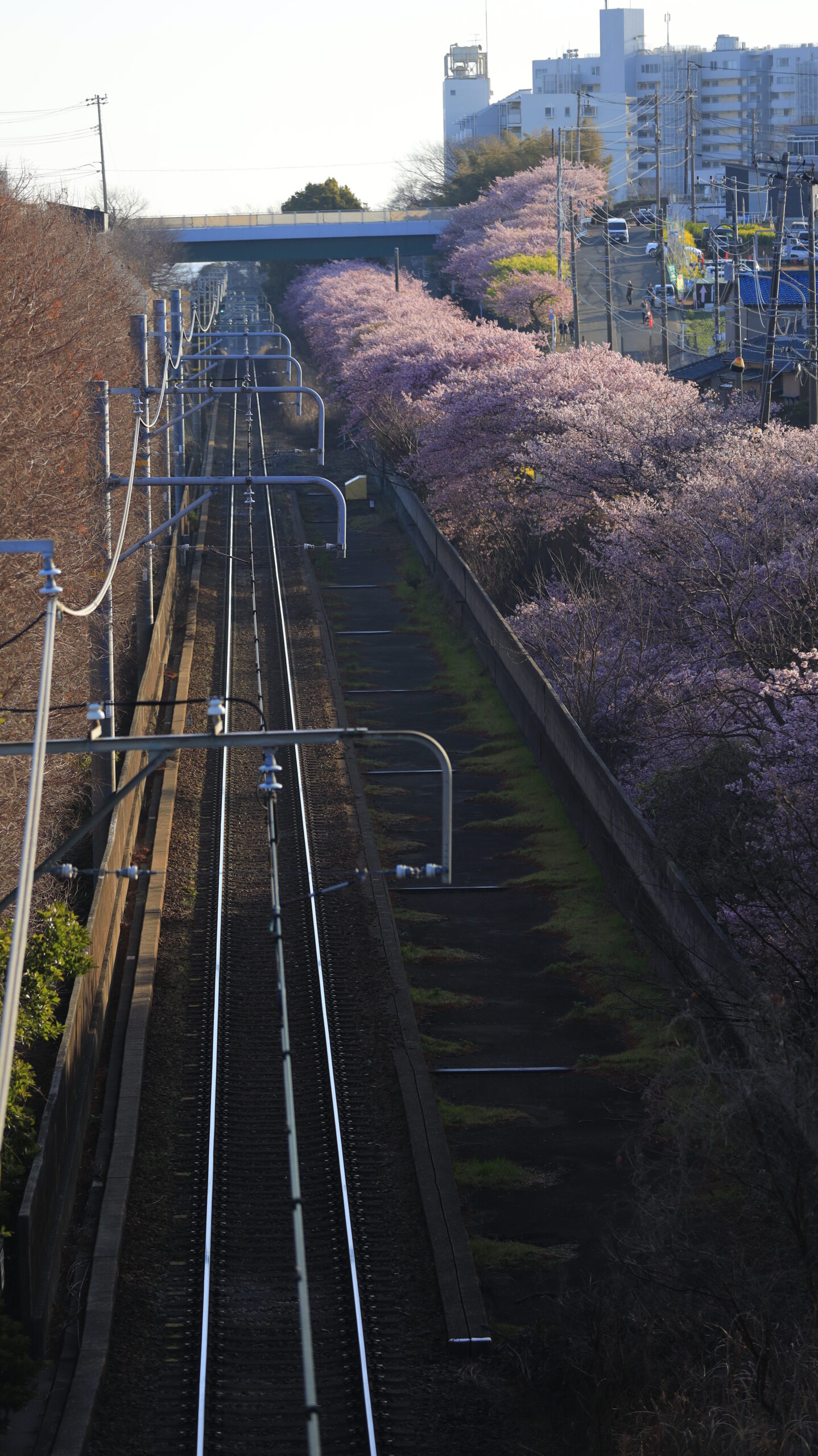 この写真は、三浦海岸桜まつりで、高い位置から線路と桜並木の様子を撮影したものです。鉄道と桜の並びを構図の中心に据えました。