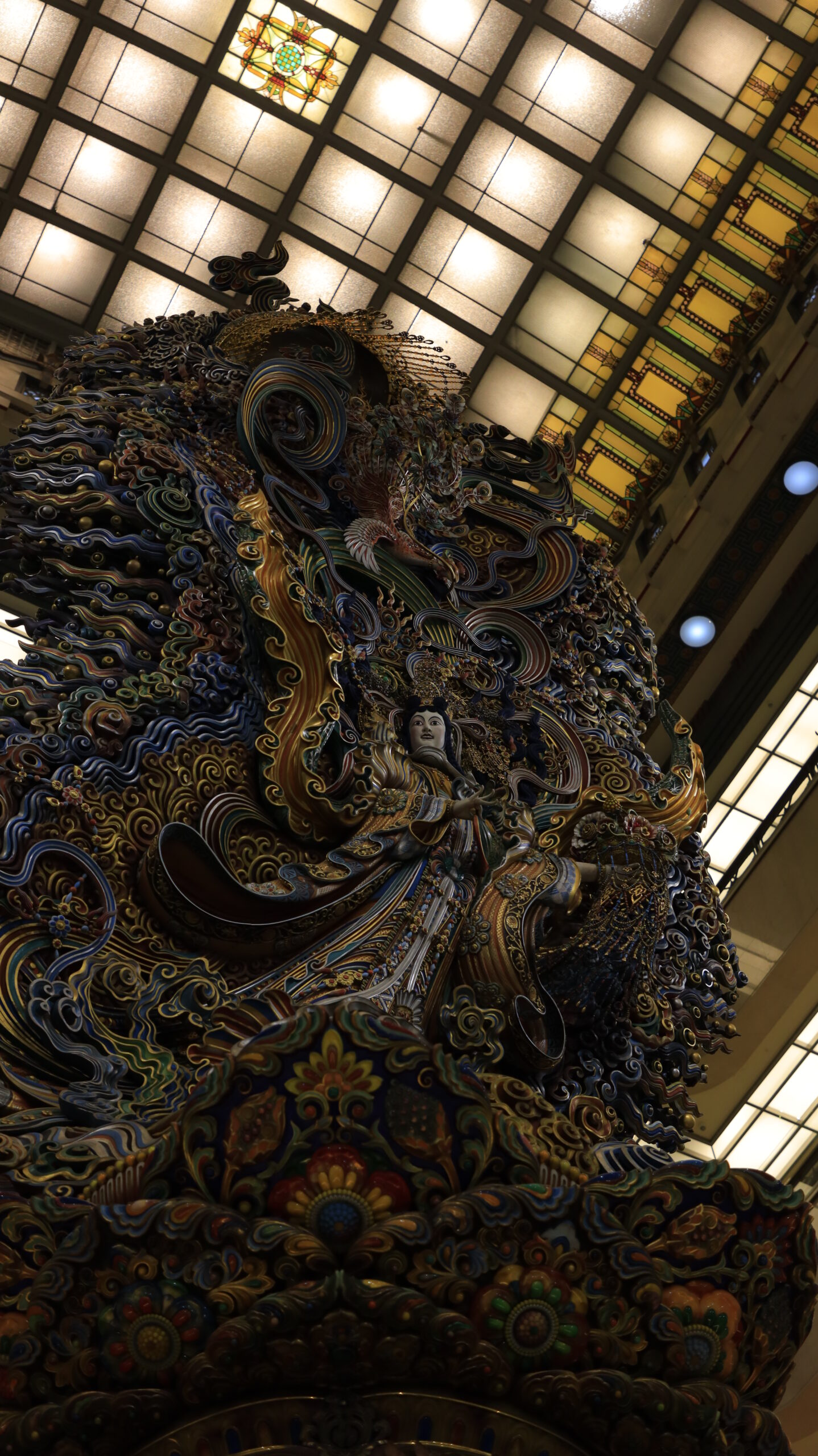この写真は、日本橋三越本店で、吹き抜けにある天女の像を斜め下から見上げる形で撮影し、優雅さと空間の広がりを表現した一枚です。