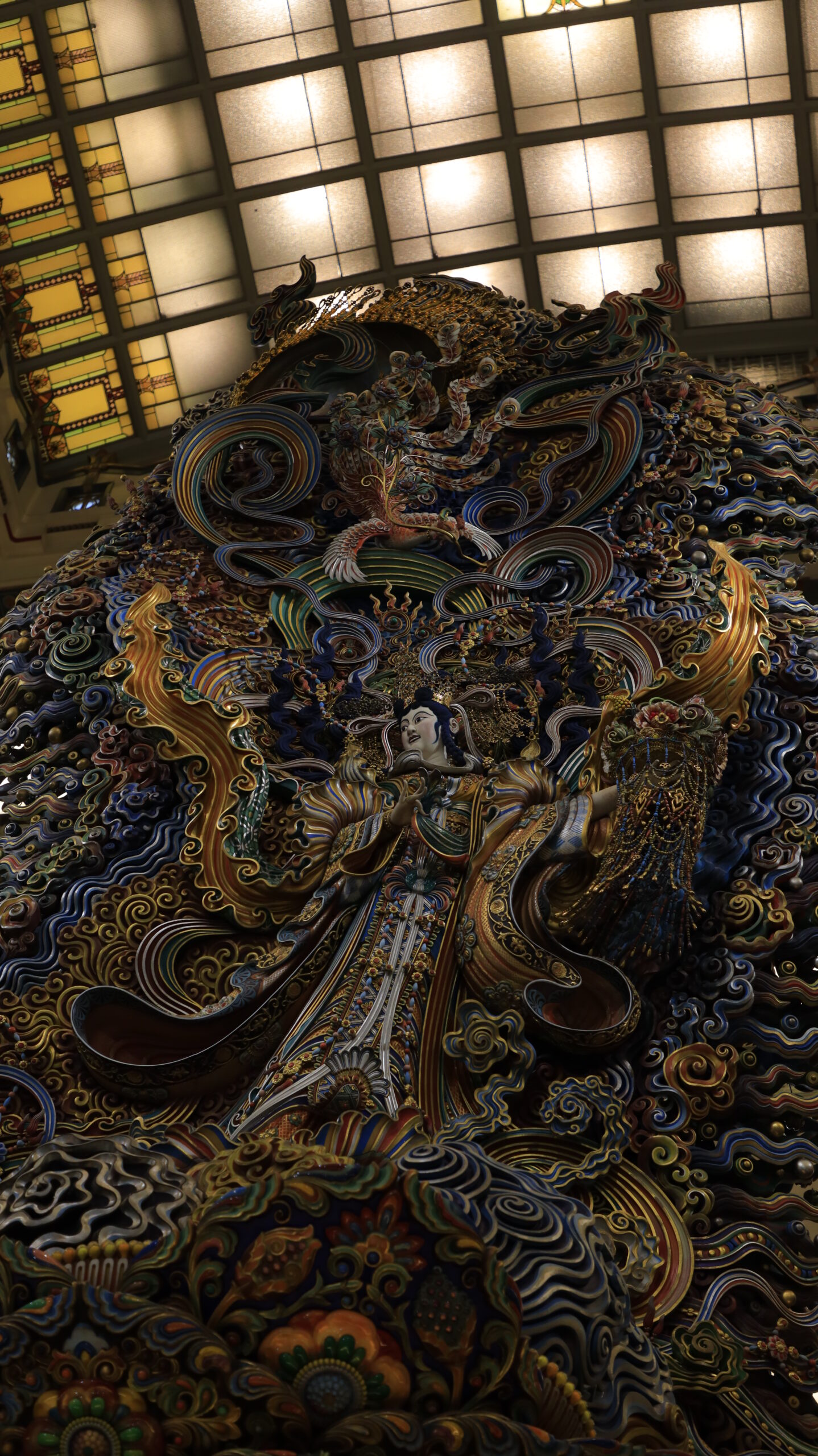 この写真は、日本橋三越本店で、美しい天女の像を下から迫力ある構図で捉え、その存在感を強調して撮影した写真です。