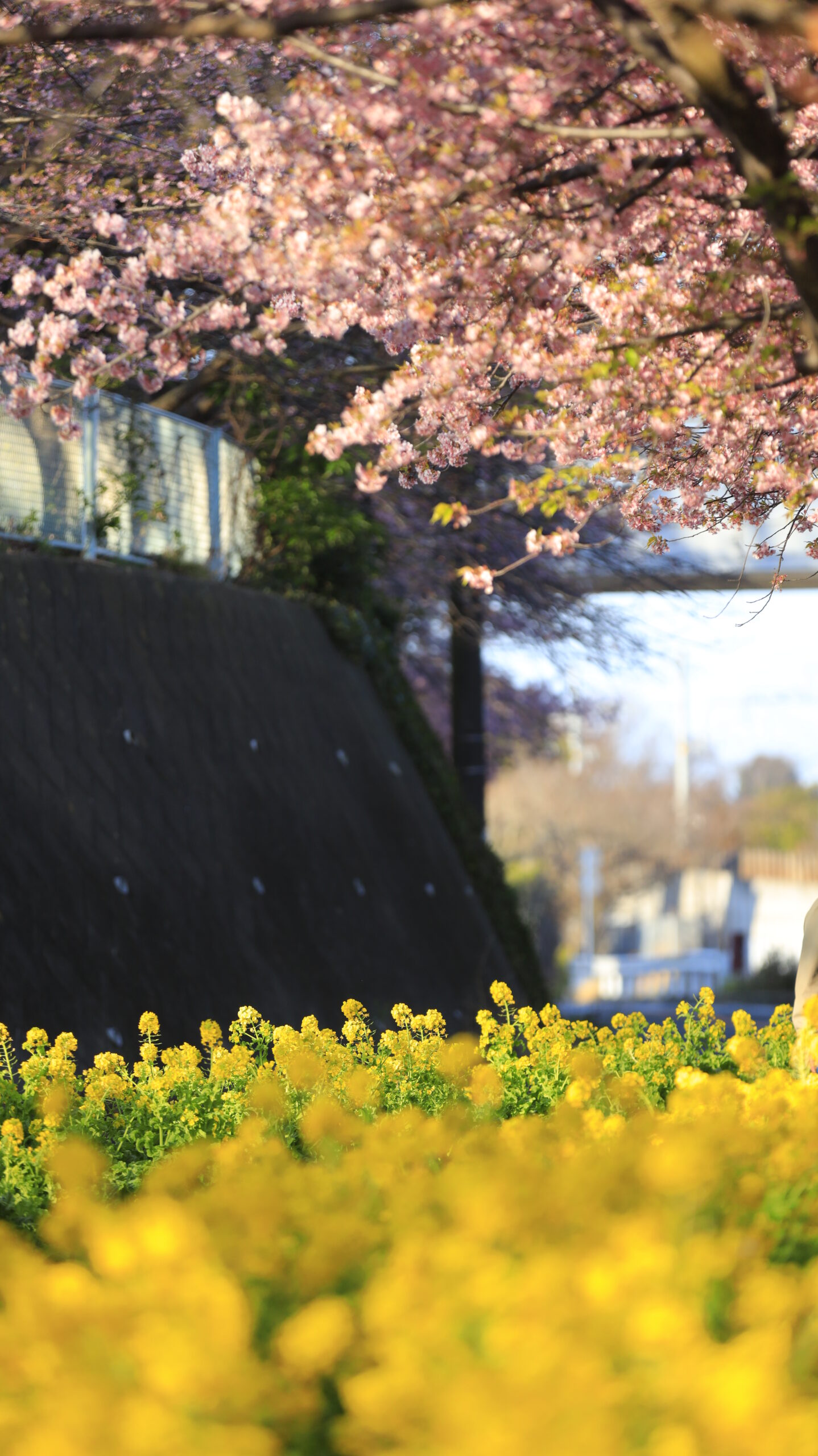 この写真は、三浦海岸桜まつりで、光に当たる菜の花と河津桜の様子を撮影したものです。黄色とピンクのコントラストが映える瞬間を狙いました。