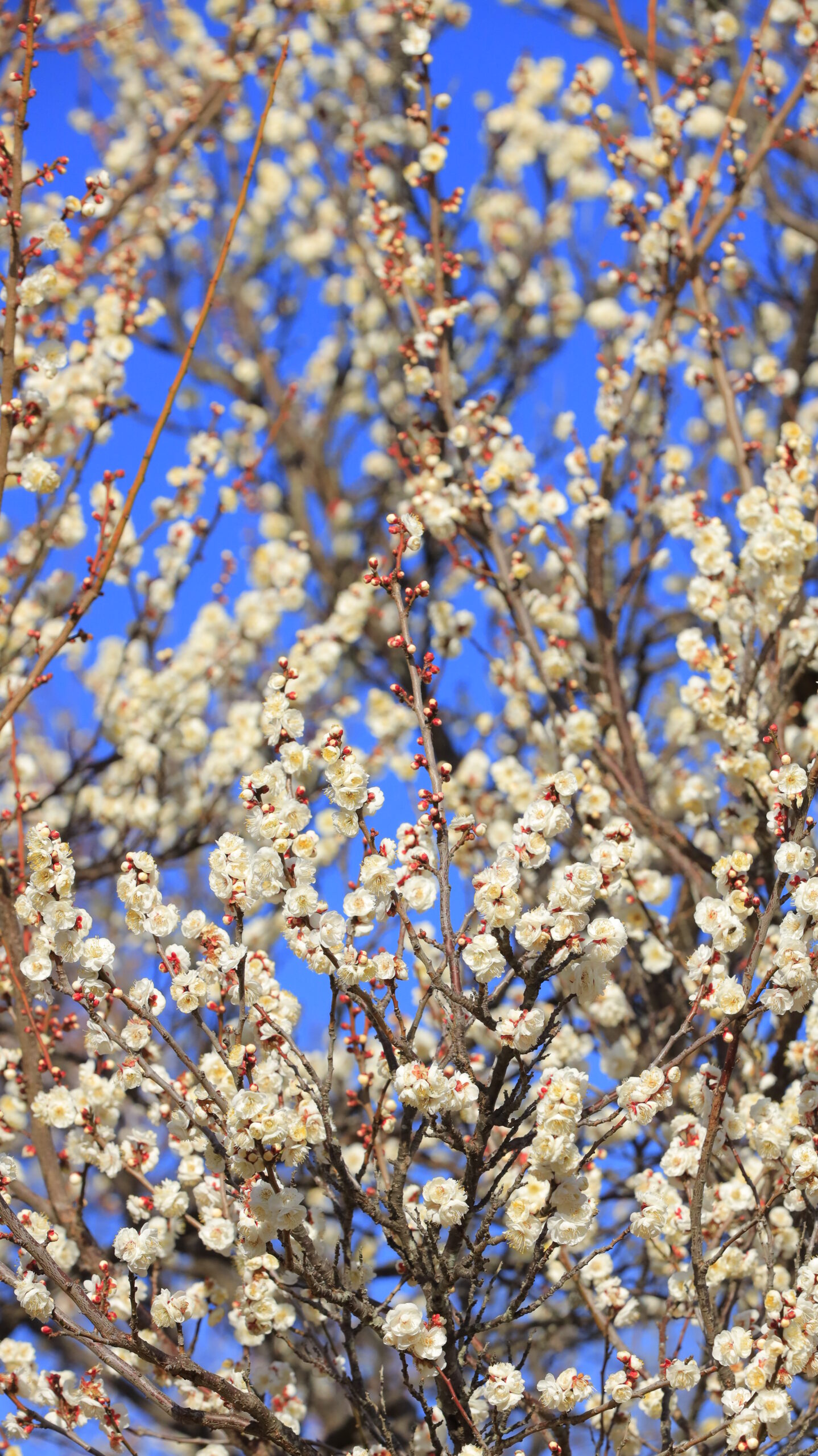 この写真は、小田原フラワーガーデンで、無数に咲く白い梅の花を一面に捉えたものです。