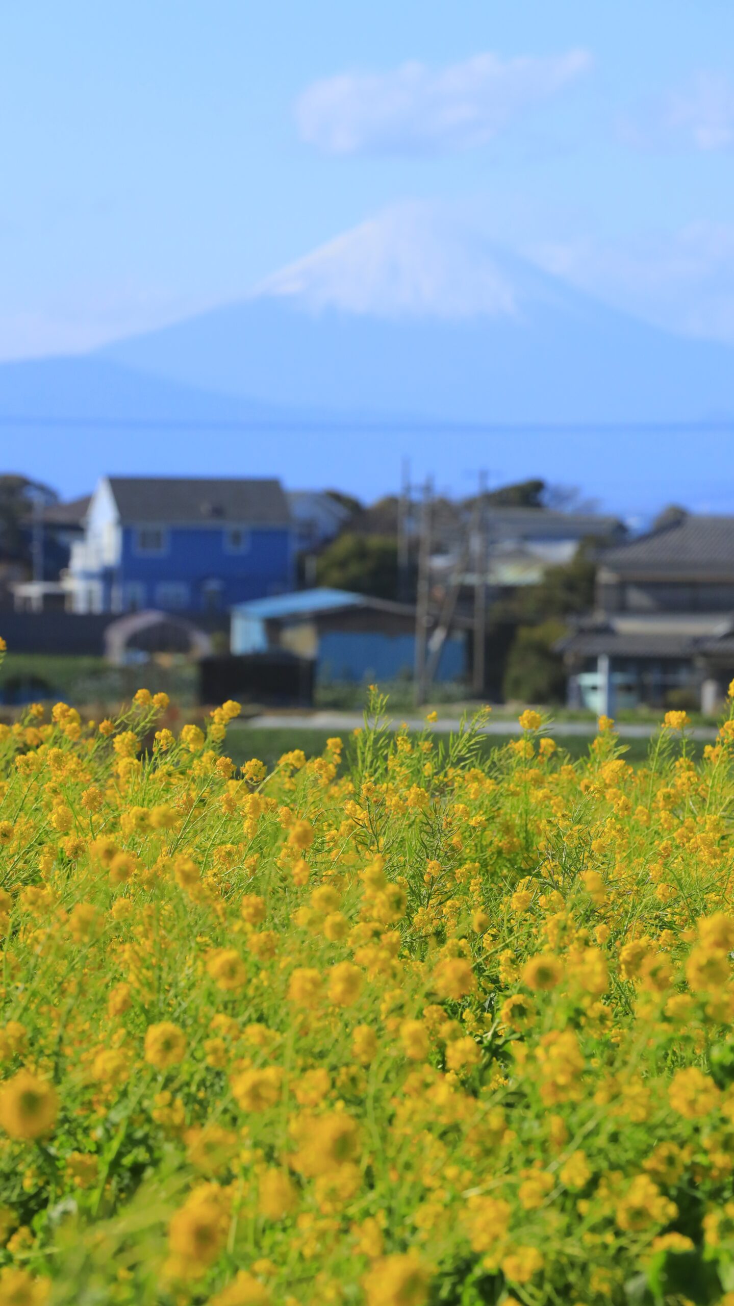 この写真は、ソレイユの丘で、菜の花畑にピントを合わせ、遠くの富士山をぼかして撮影した一枚です。