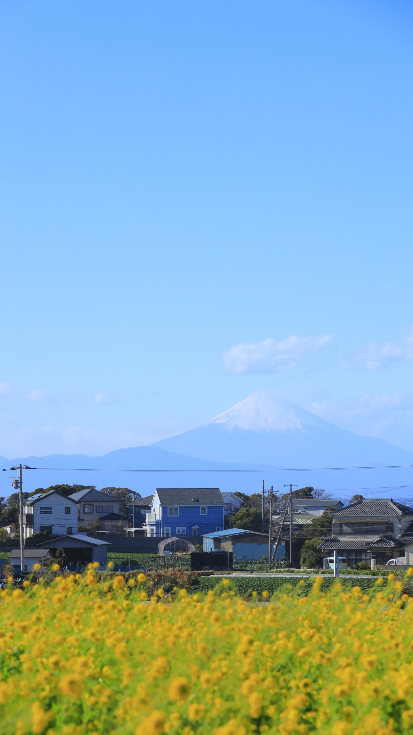 この写真は、ソレイユの丘で、うっすらと見える富士山と菜の花を一緒に撮影したものです。