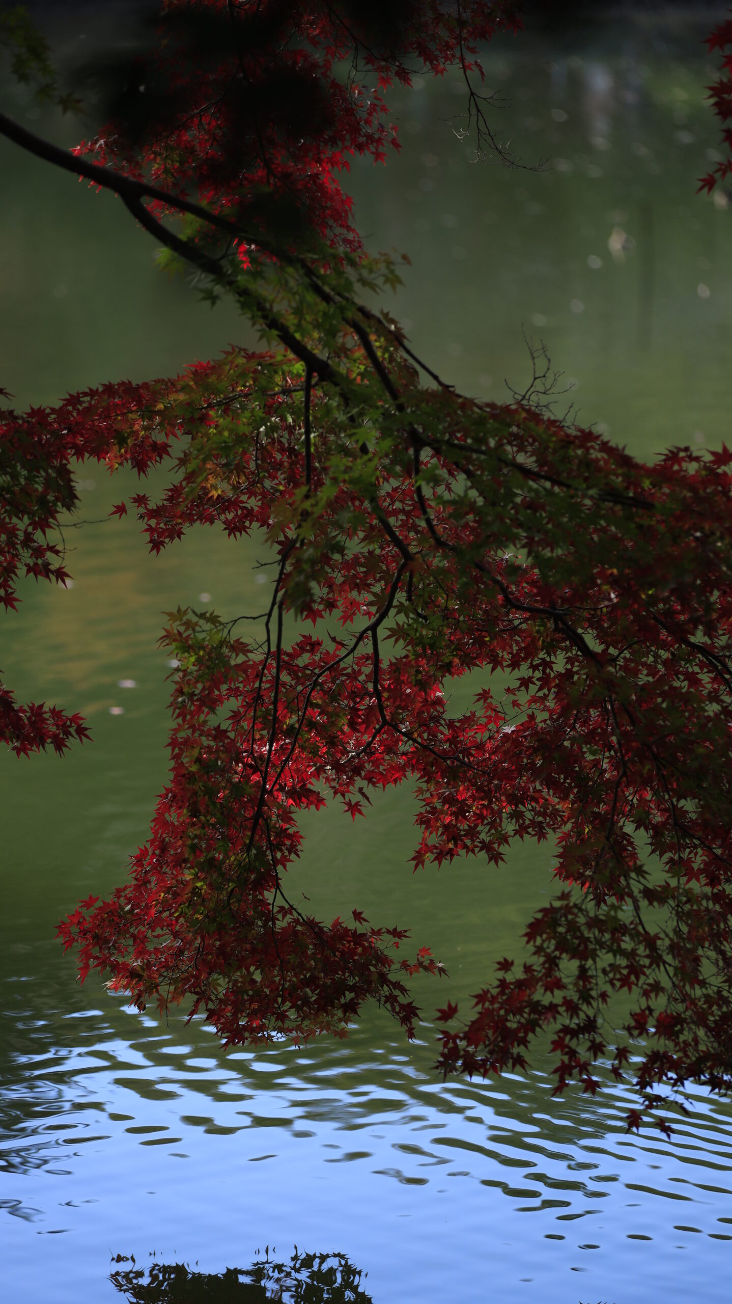 この写真は、町田薬師池公園で、モミジの枝が池へ向かって垂れ下がる様子を撮影したものです。水面へ伸びる枝が柔らかな雰囲気を演出しています。