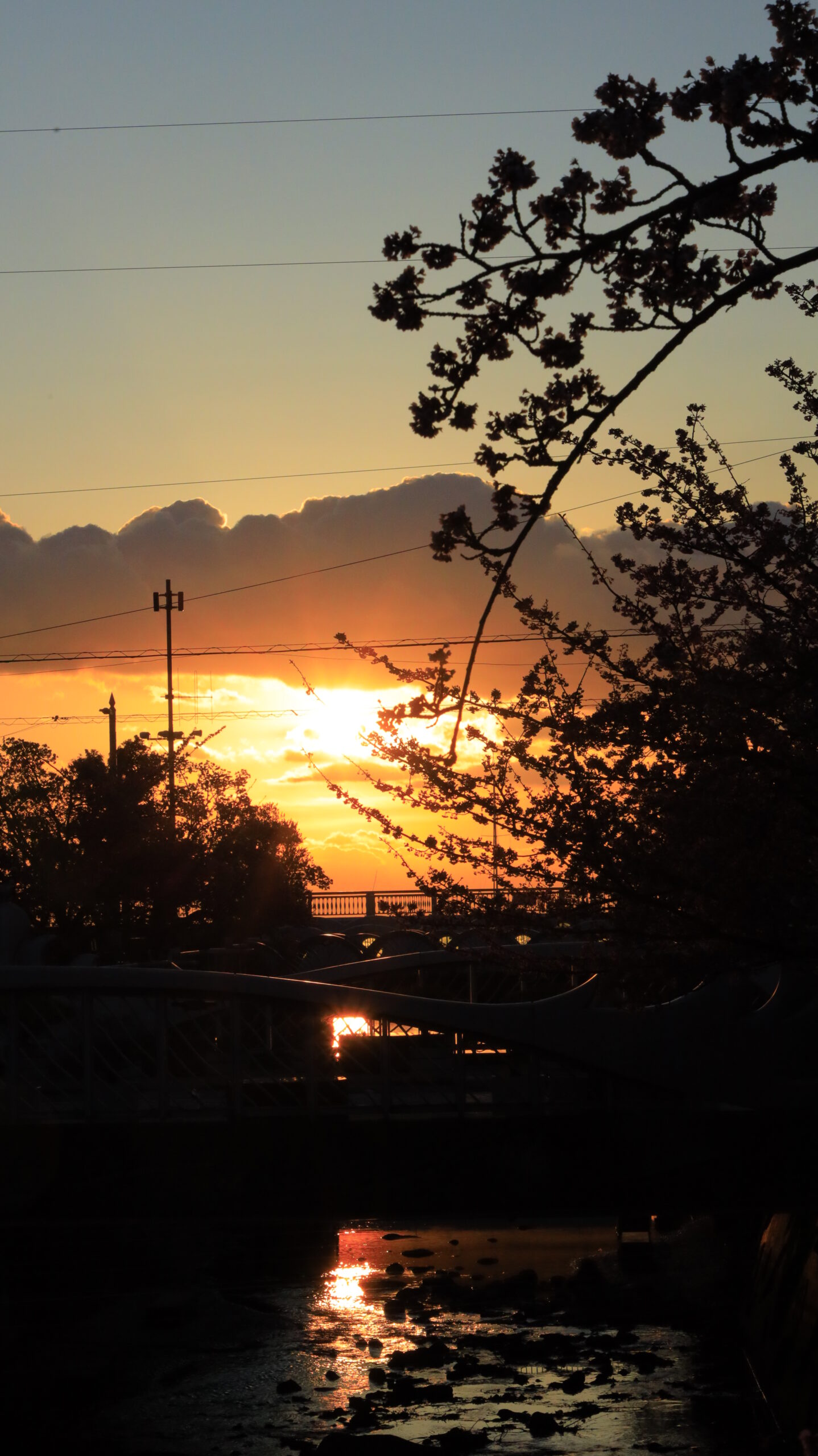 この写真は、あたみ桜糸川桜まつりで、桜のシルエットと朝焼けが重なる幻想的な様子を撮影したものです。