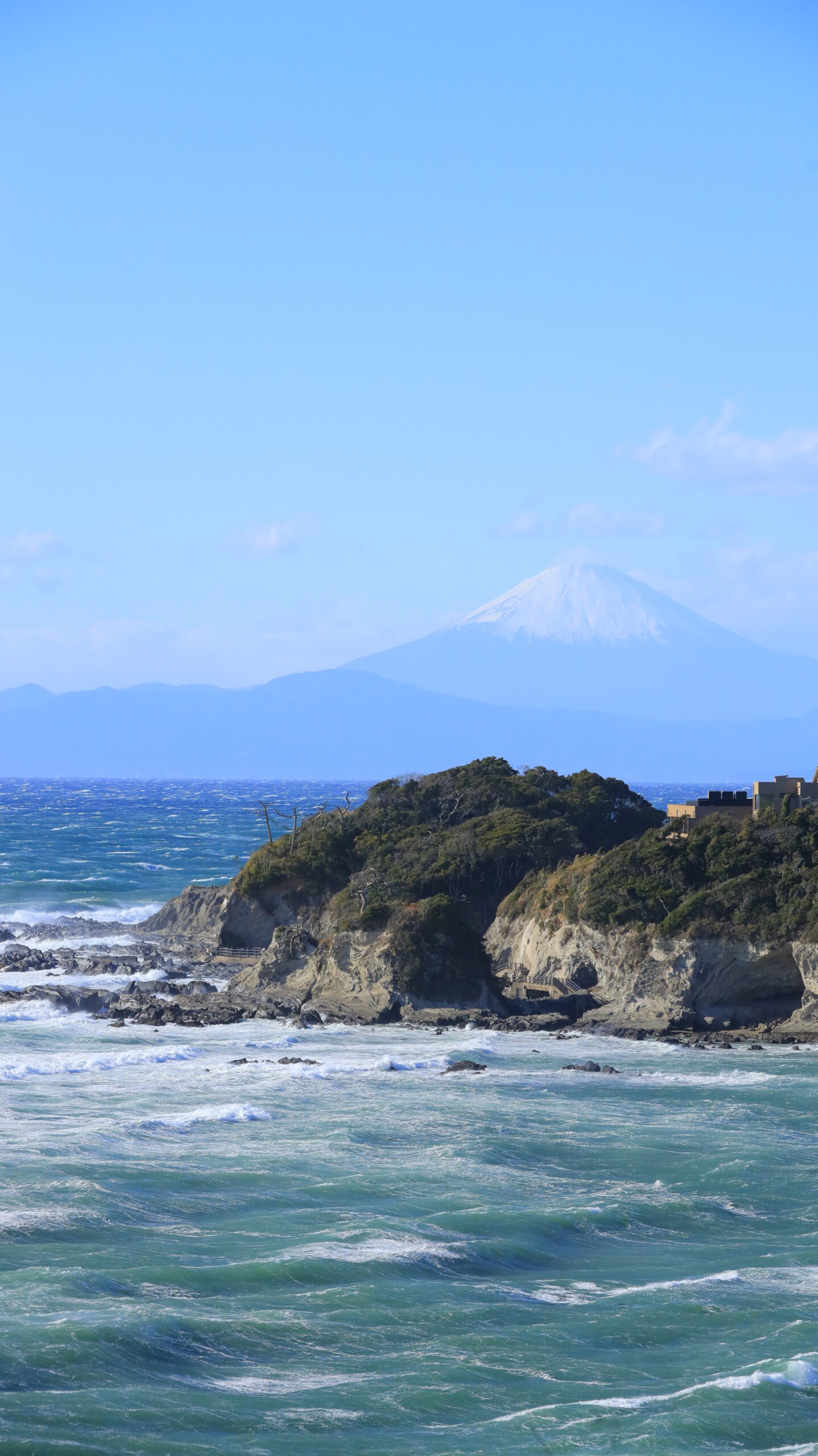 この写真は、ソレイユの丘で、奥のキャンプ場近くのデッキから見える富士山と海の様子を撮影しました。