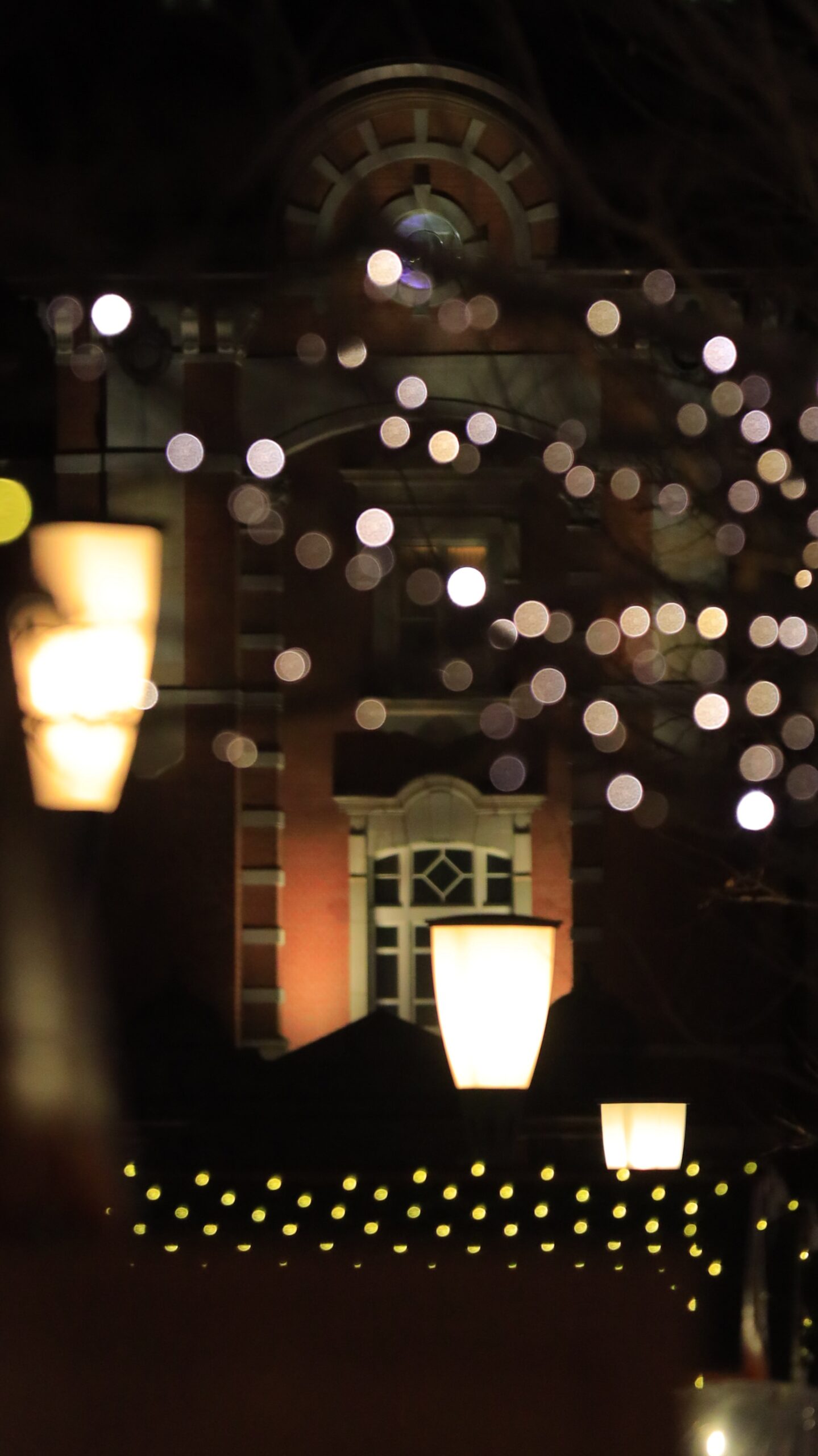 この写真は、東京駅丸の内のイルミネーション越しに東京駅舎を捉え、光と建築のコントラストを楽しめる一枚です。