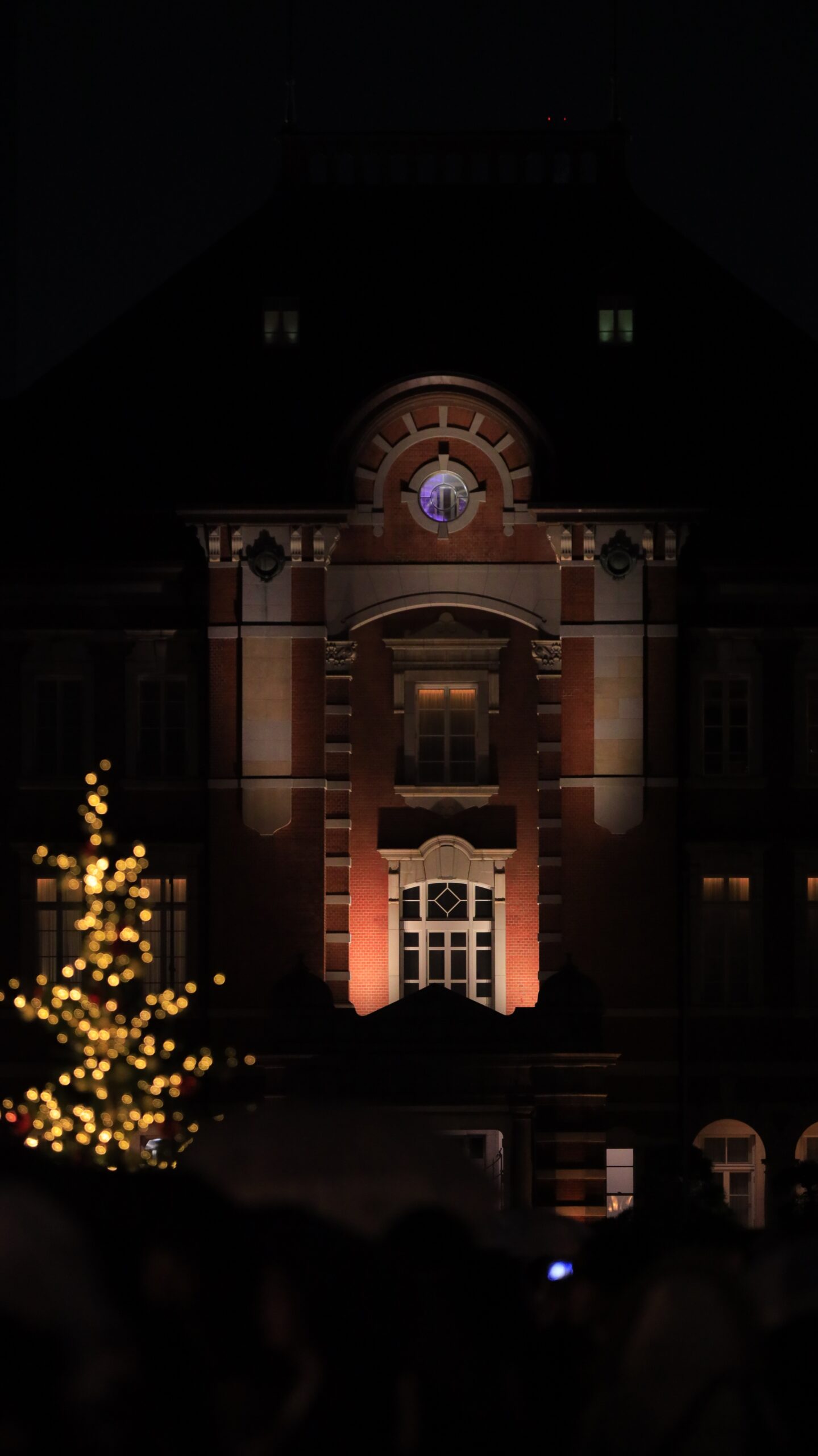 この写真は、東京駅丸の内のイルミネーションで、東京駅にピントを合わせ、隣にあるクリスマスツリーの光をポイントとして配置した写真です。