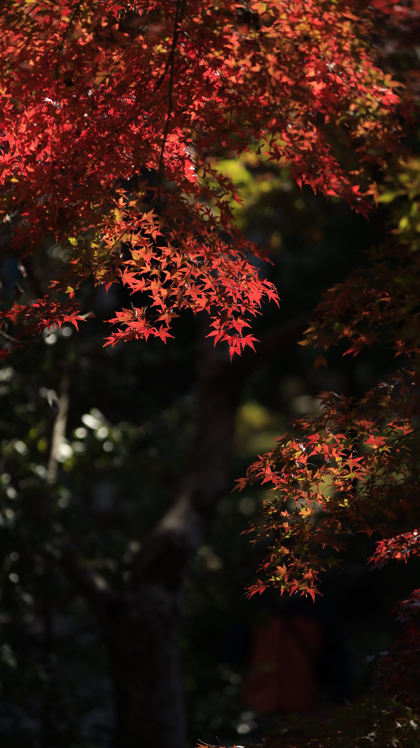 この写真は、深大寺で、暗がりの中で真っ赤なモミジが光を受けて輝く様子を撮影したものです。影と光が生むコントラストが美しい印象的な紅葉です。