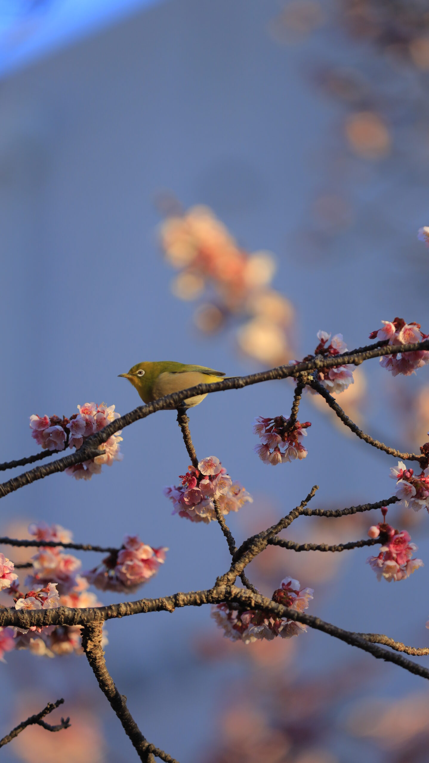 この写真は、あたみ桜糸川桜まつりで、あたみ桜の枝にたたずむメジロの様子を撮影したものです。