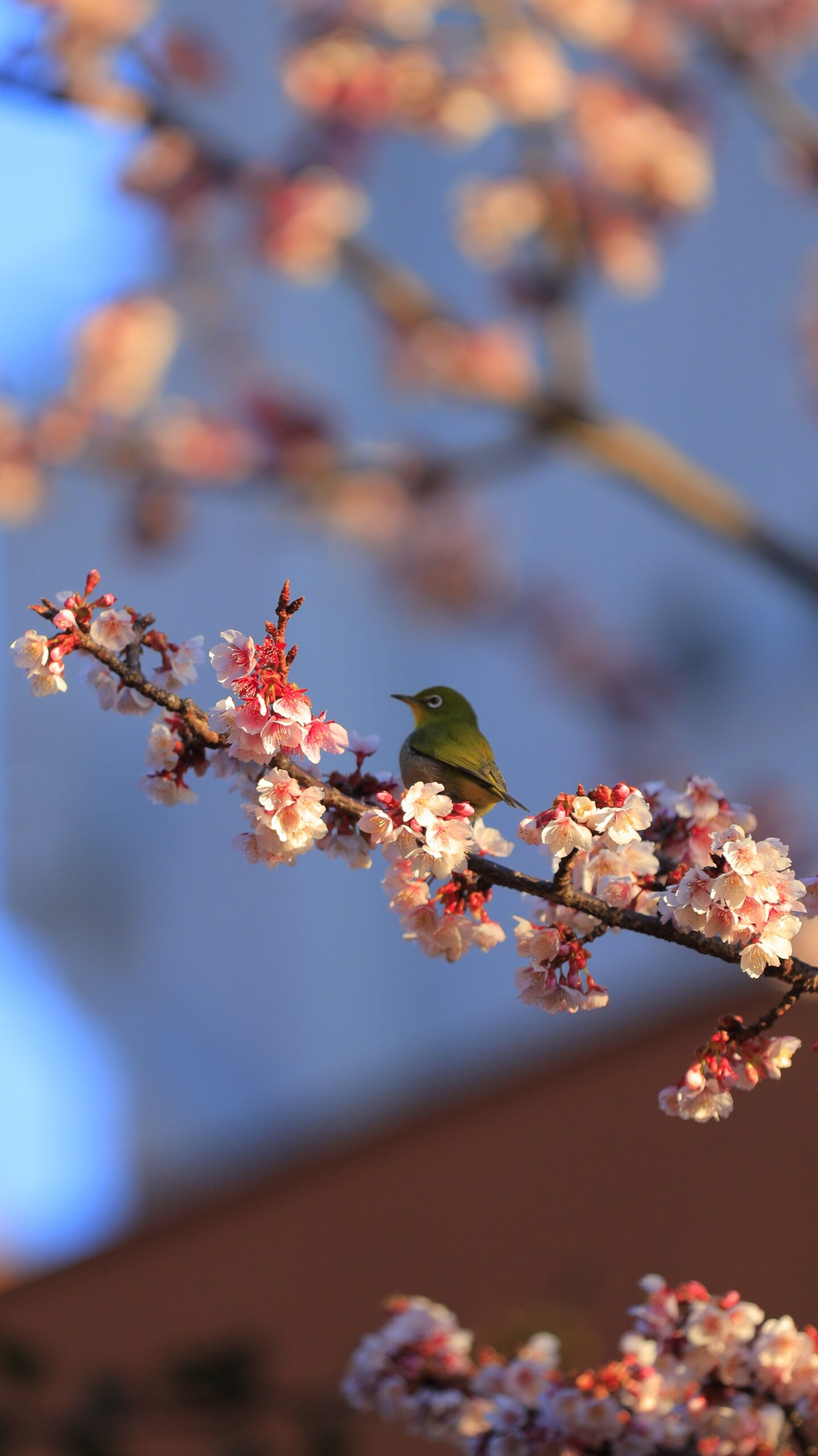 この写真は、あたみ桜糸川桜まつりで、熱海桜の枝の上で一休みするメジロの姿を撮影したものです。