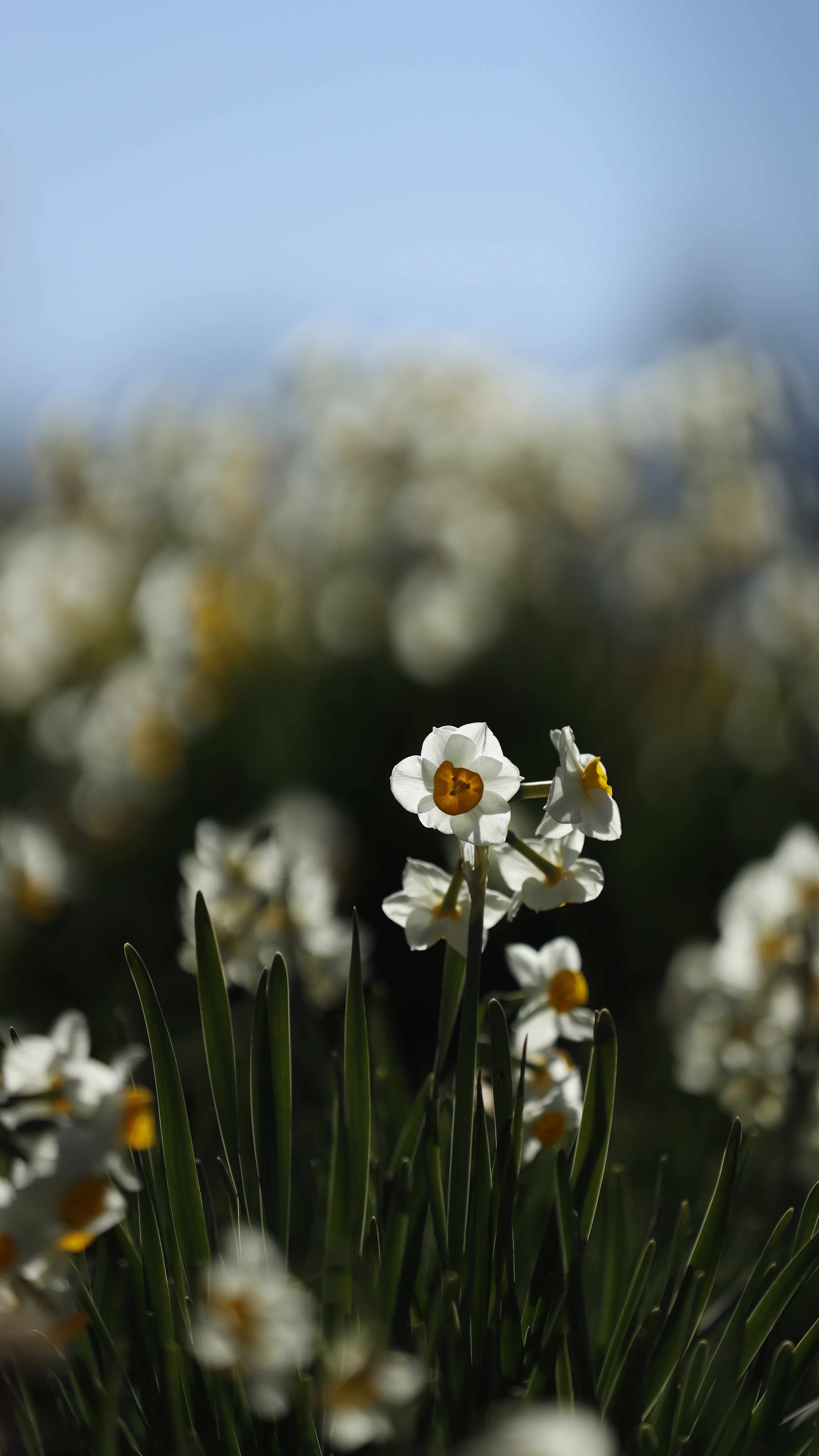 この写真は、逆光の中で、水仙の花が透き通るような姿を表現しながら撮影してみました。冬の冷たく澄んだ空気の中、吾妻山公園ではペーパーホワイト(水仙)が可憐に咲いています。純白の花びらが陽の光を受け、やさしく輝く姿が印象的です。山頂へ向かう途中にも水仙が点在し、ふんわりと広がる光とともに楽しむことができます。特に朝の時間は、朝露や逆光が繊細な花びらを際立たせ、より幻想的な雰囲気を作り出します。