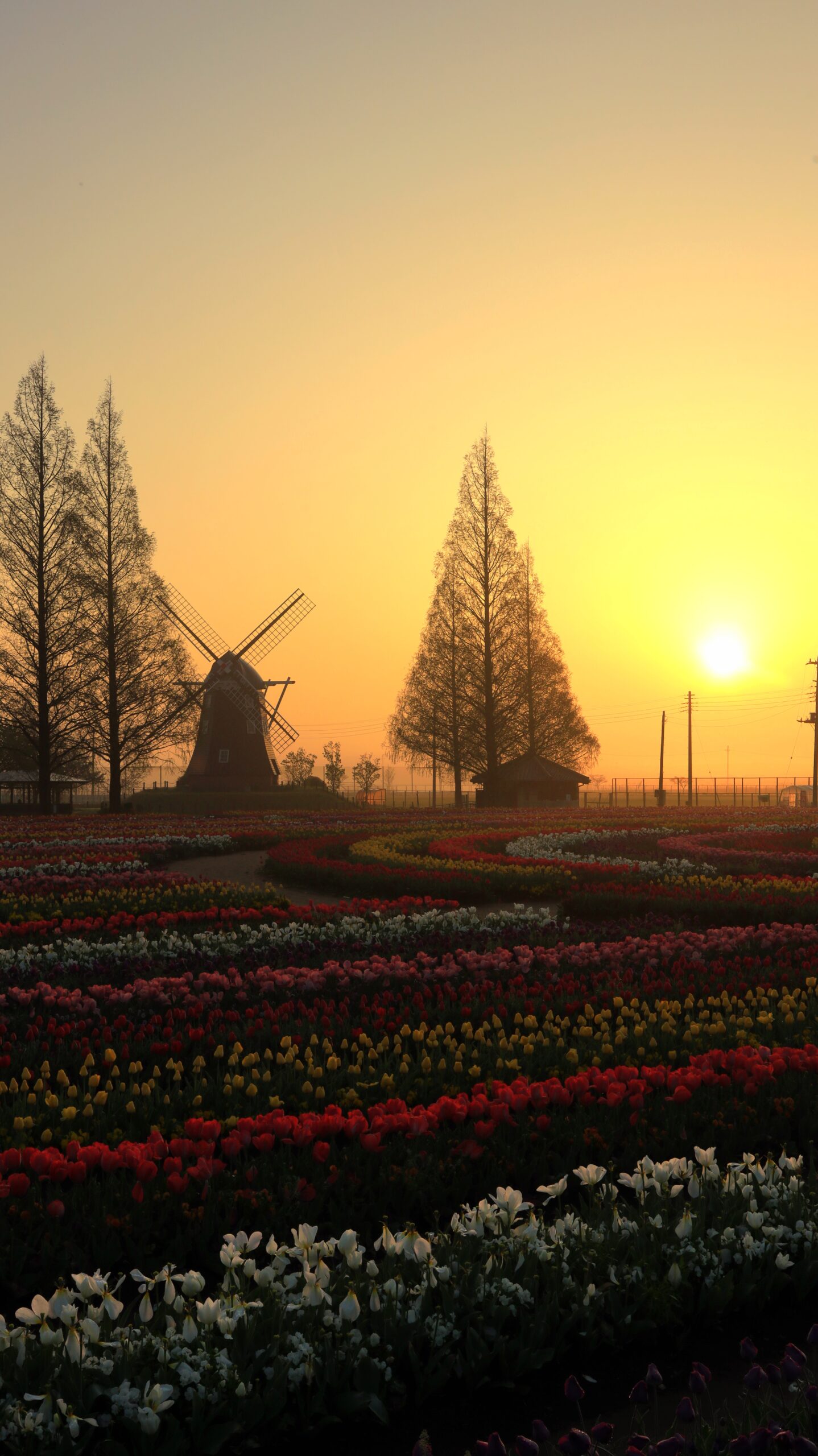 この写真は、あけぼの山農業公園で、霞を抜けた光が差し込み始めた段階の風車とチューリップ畑の印象的な光景を撮影したものです。