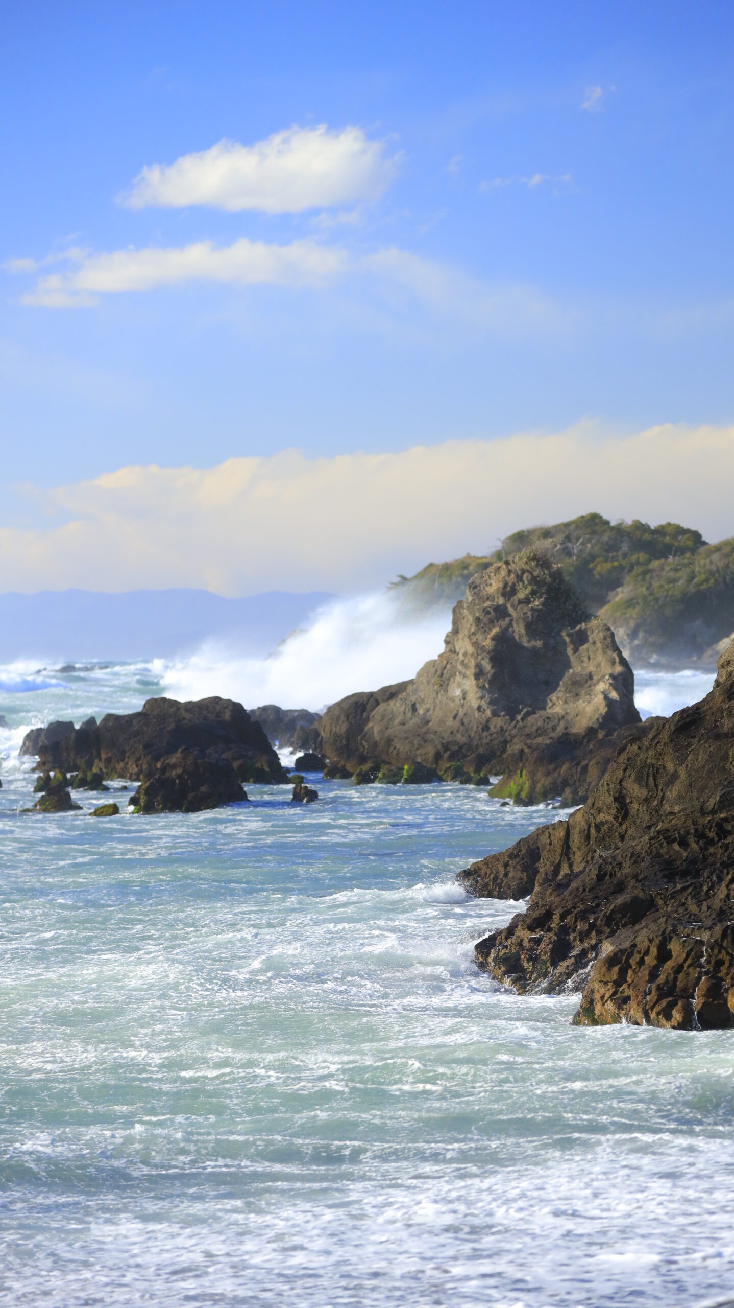 この写真は、ソレイユの丘で、岩に波が当たり、しぶきが飛び散る瞬間を撮影したものです。