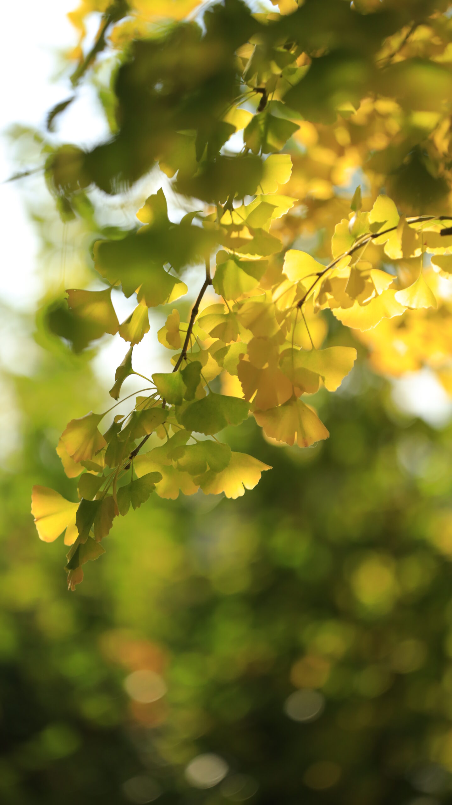 この写真は、武蔵国分寺公園で、黄色に紅葉した銀杏と、まだ緑の銀杏が光に当たって混ざり合う様子を撮影したものです。季節の変化が同時に感じられる印象的な景色です。