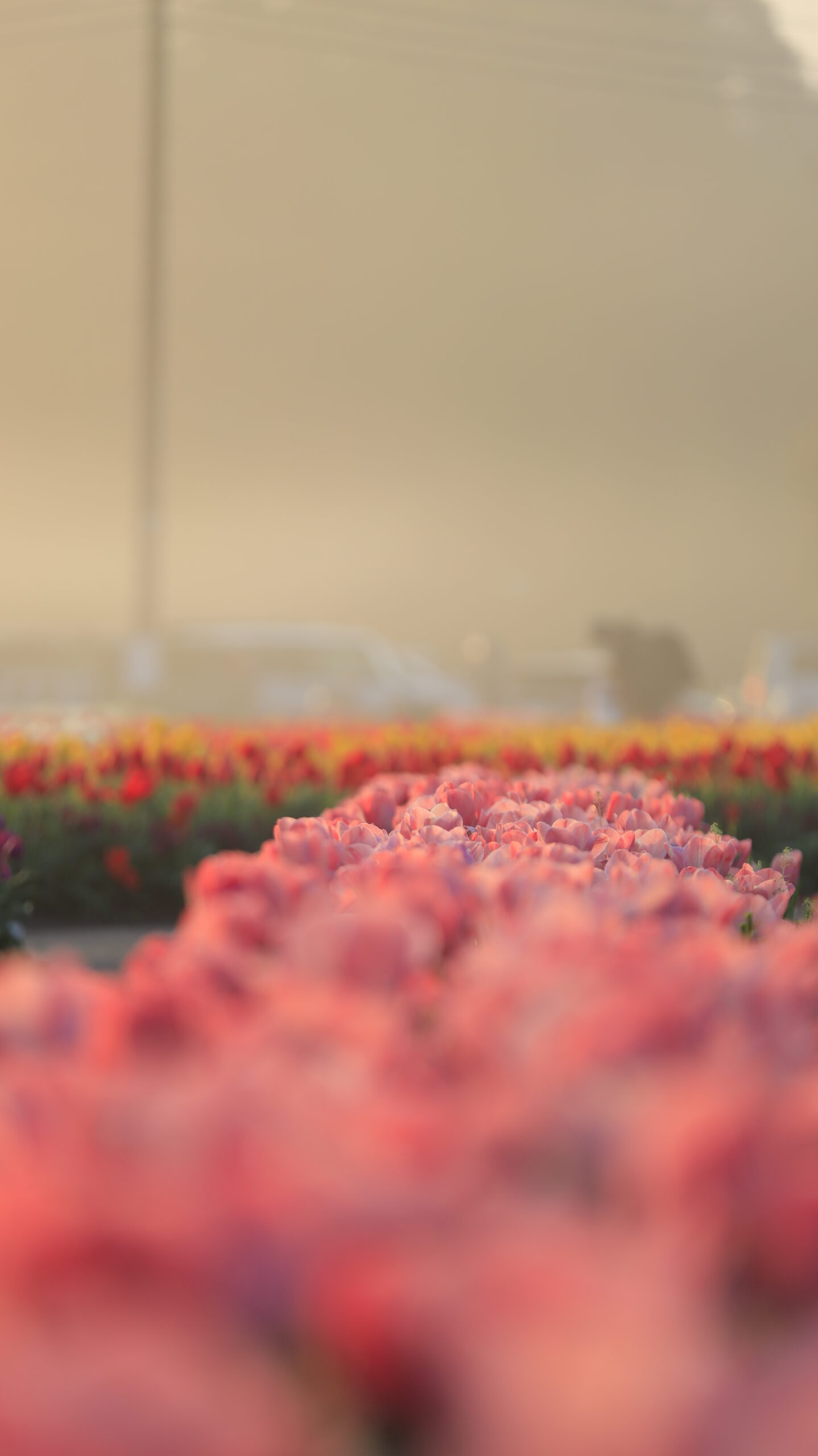 この写真は、あけぼの山農業公園で、並ぶチューリップ畑の中央にピントを合わせ、遠くの車や人を大きくぼかして奥行きを表現したものです。