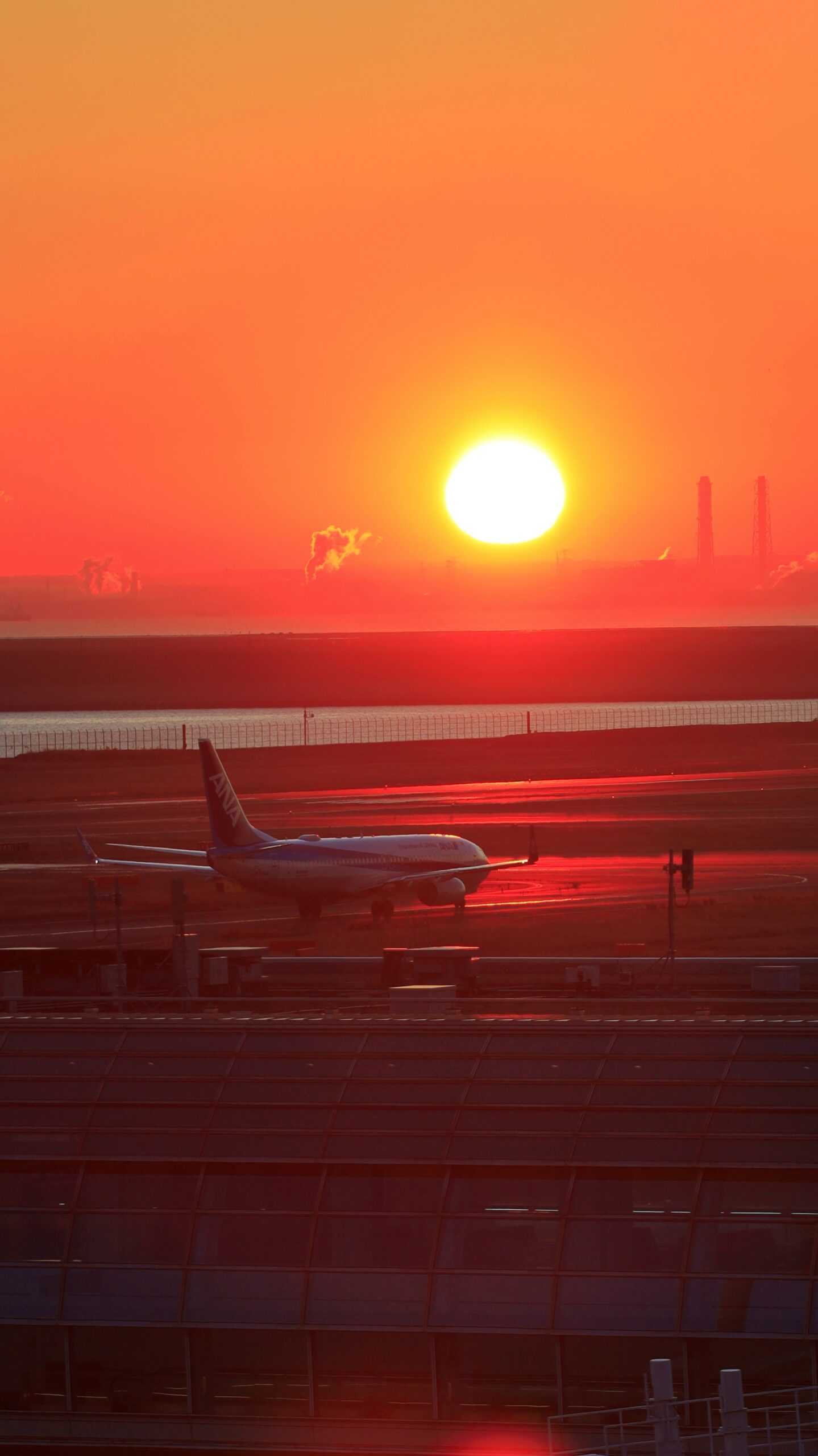 この写真は、羽田空港 第2ターミナル 5F展望デッキで、飛び立つ準備をしている飛行機と日の出、工場の様子をあわせて撮影したものです。