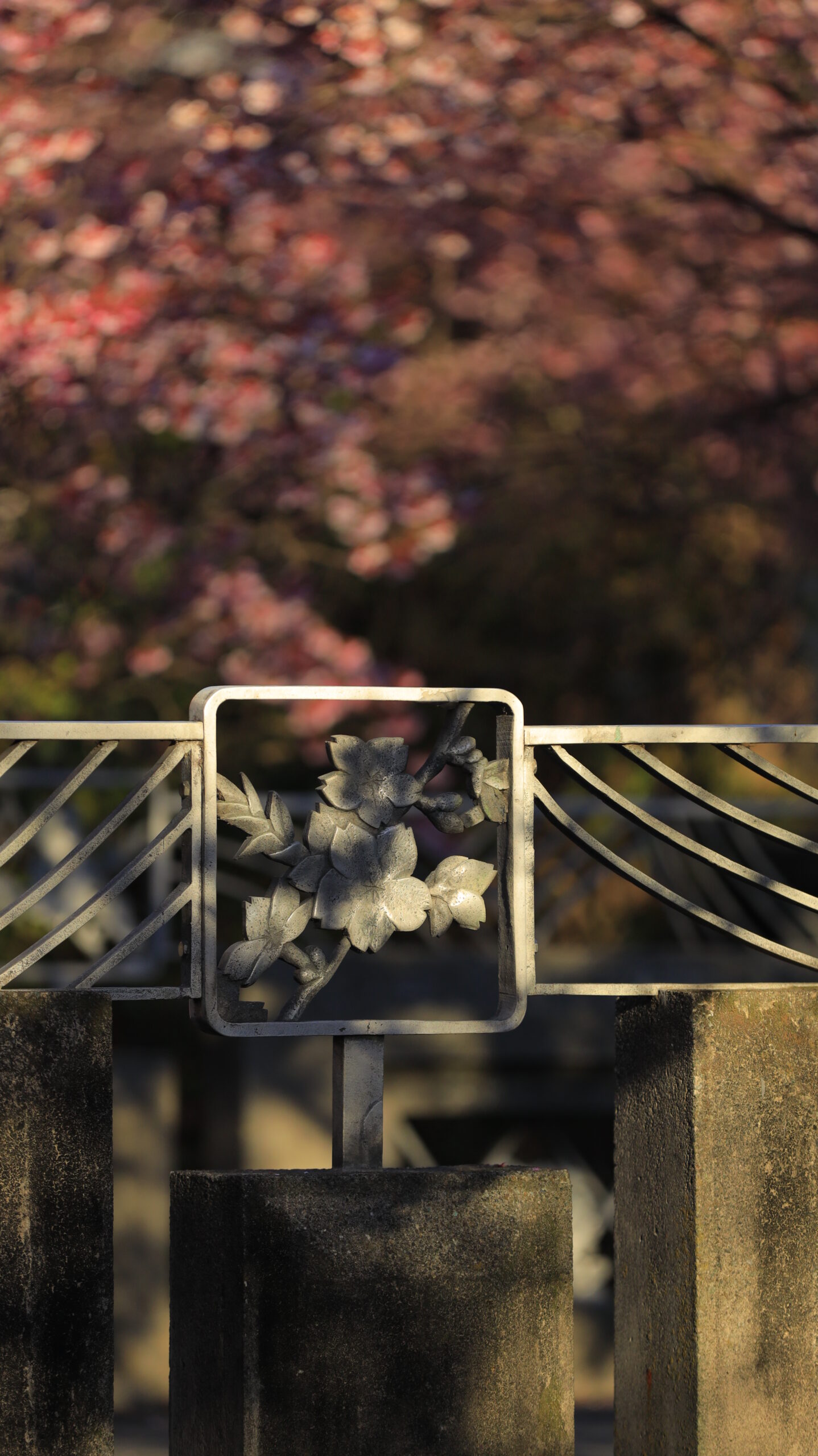 この写真は、あたみ桜糸川桜まつりで、桜を背景に橋の柵を組み合わせ、街の風景として撮影したものです。
