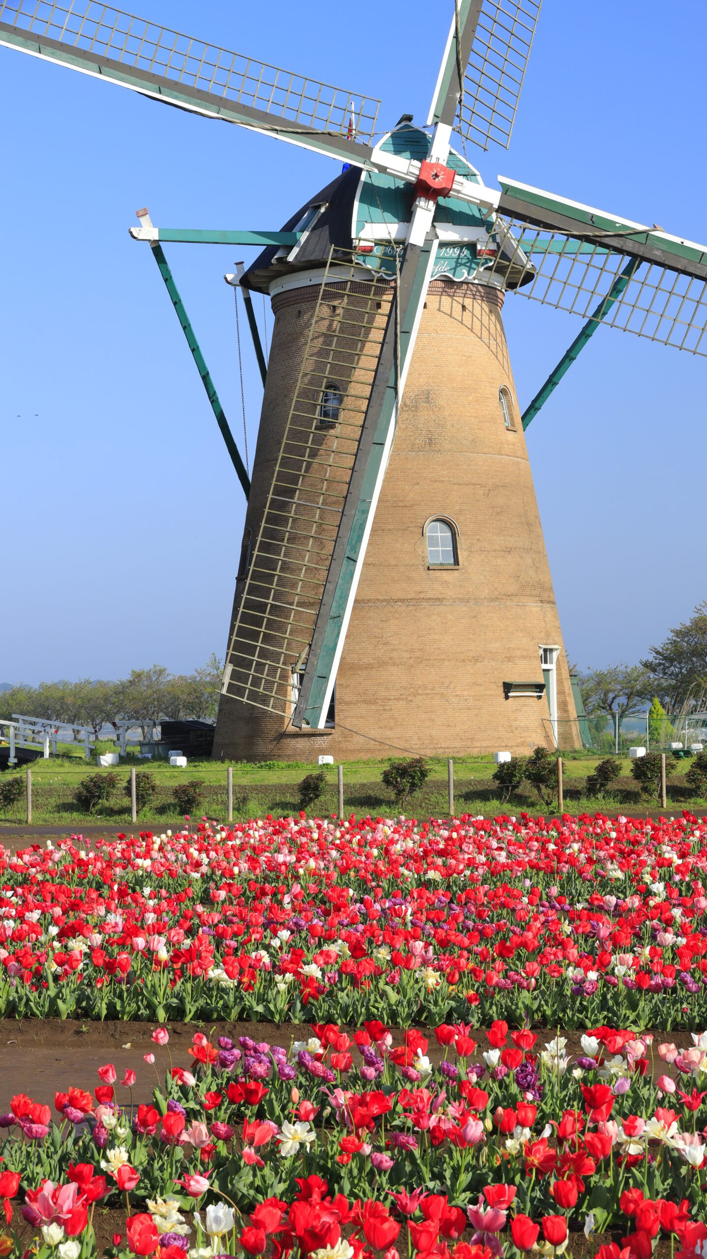 この写真は、佐倉ふるさと広場で、赤を基調としたチューリップと風車の組み合わせを撮影したものです。