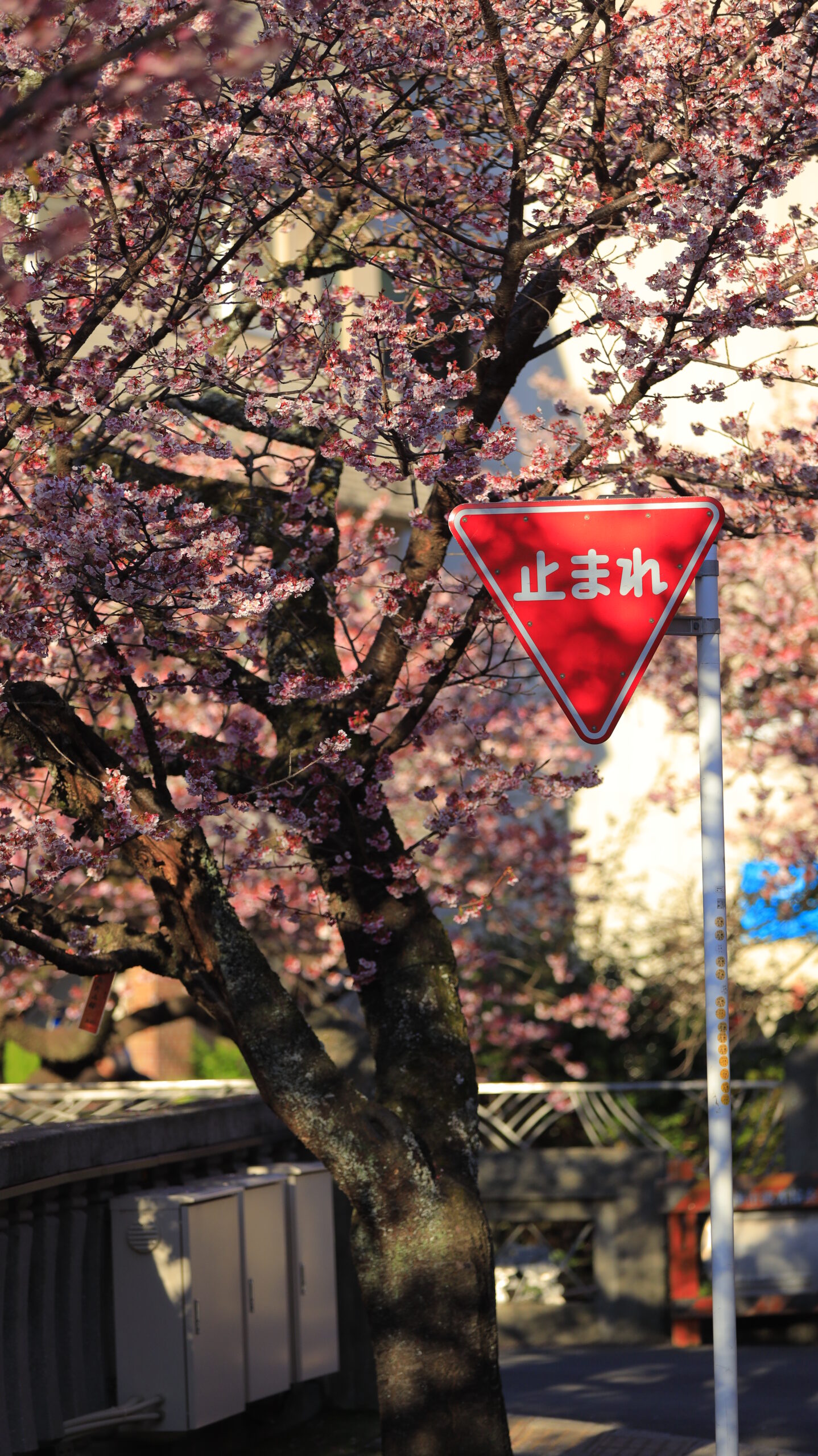 この写真は、あたみ桜糸川桜まつりで、桜の木を背景に「とまれ」の看板を印象的に撮影したものです。