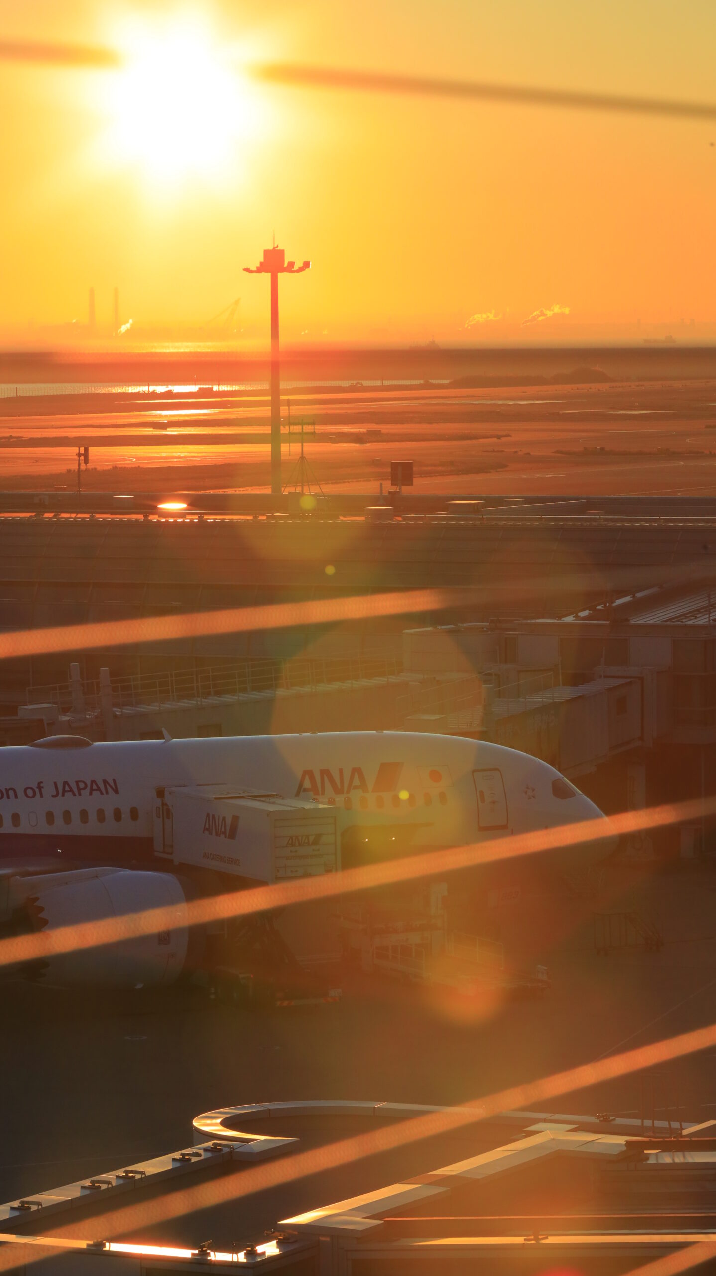羽田空港 第2ターミナル 5F展望デッキで、準備中の飛行機と朝焼けと光のゴーストが綺麗に見えた場面を撮影した画像