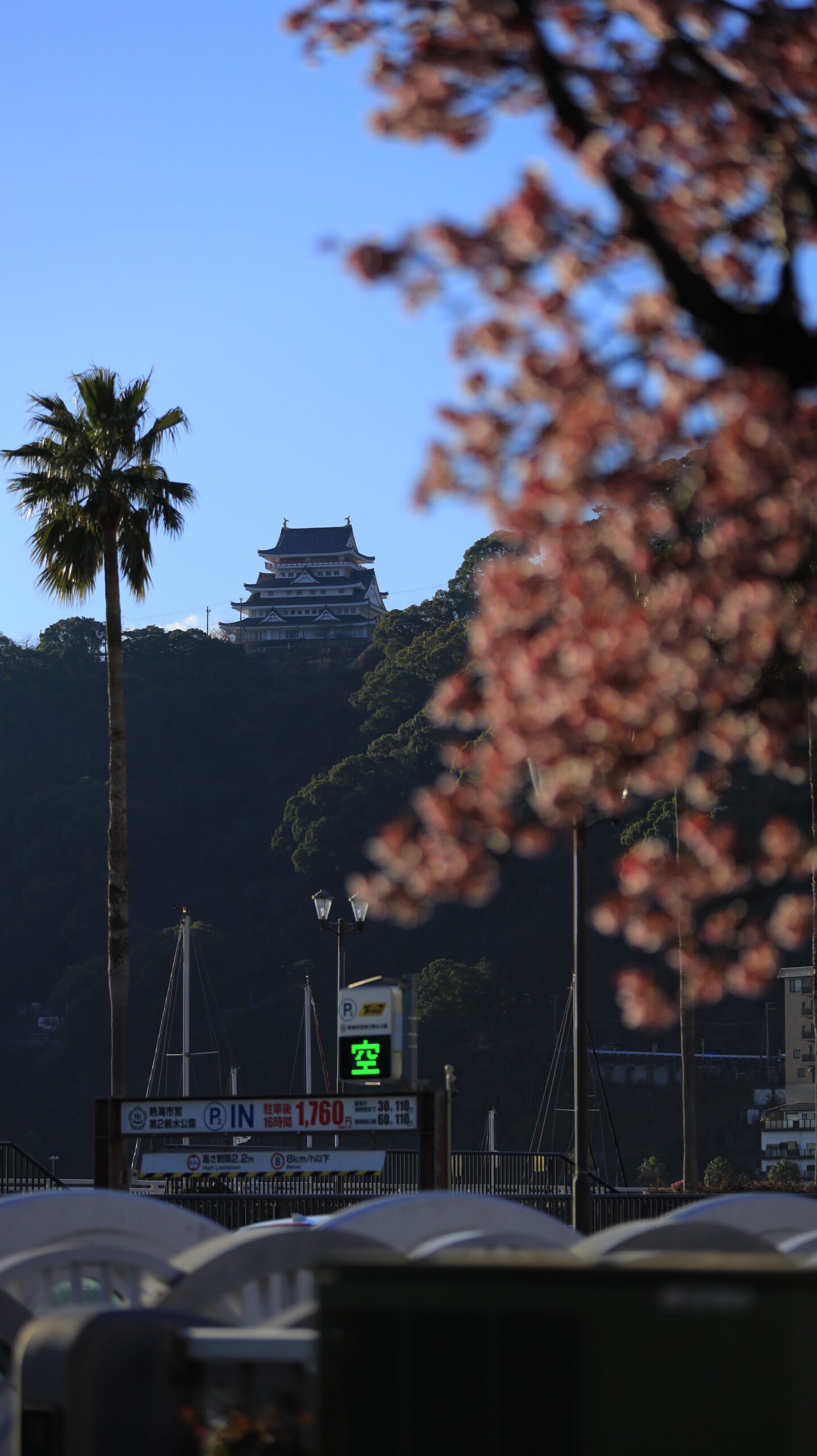 この写真は、あたみ桜糸川桜まつりで、川の河口近くから桜の花と熱海城を一緒に捉えたものです。