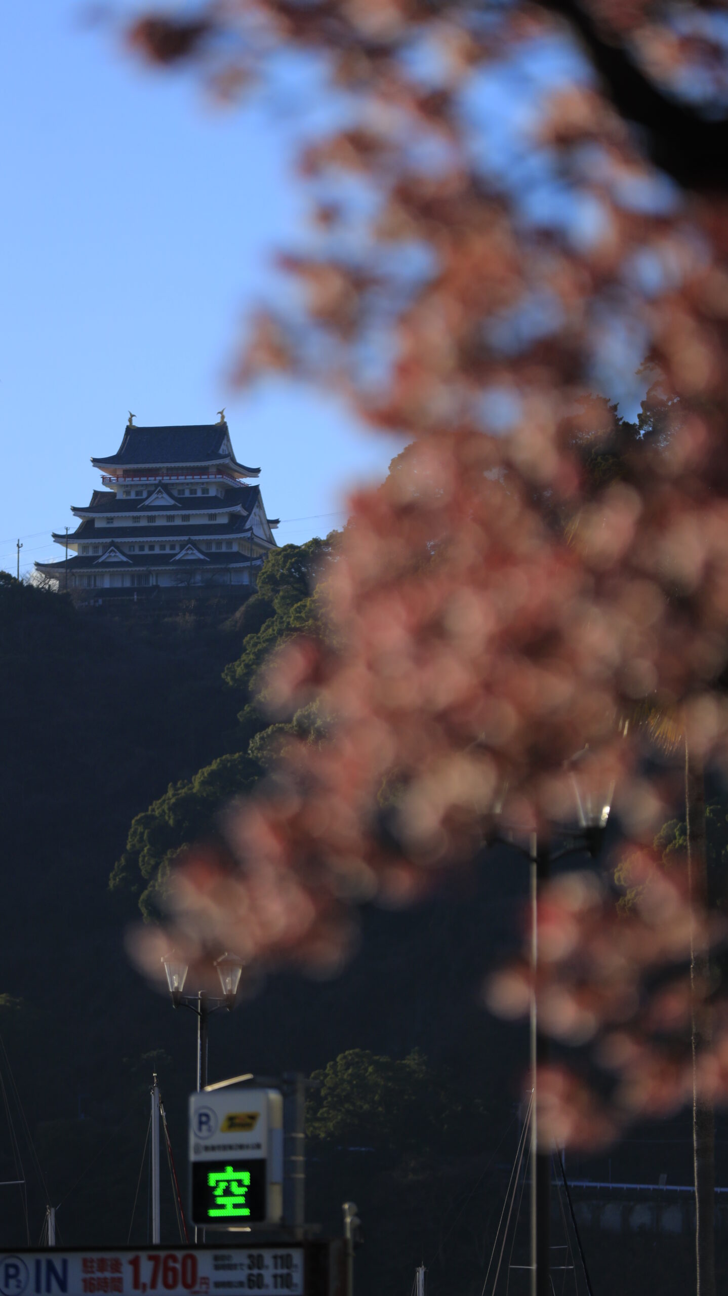 この写真は、あたみ桜糸川桜まつりで、熱海城にピントを合わせ、手前の桜をぼかして撮影したものです。