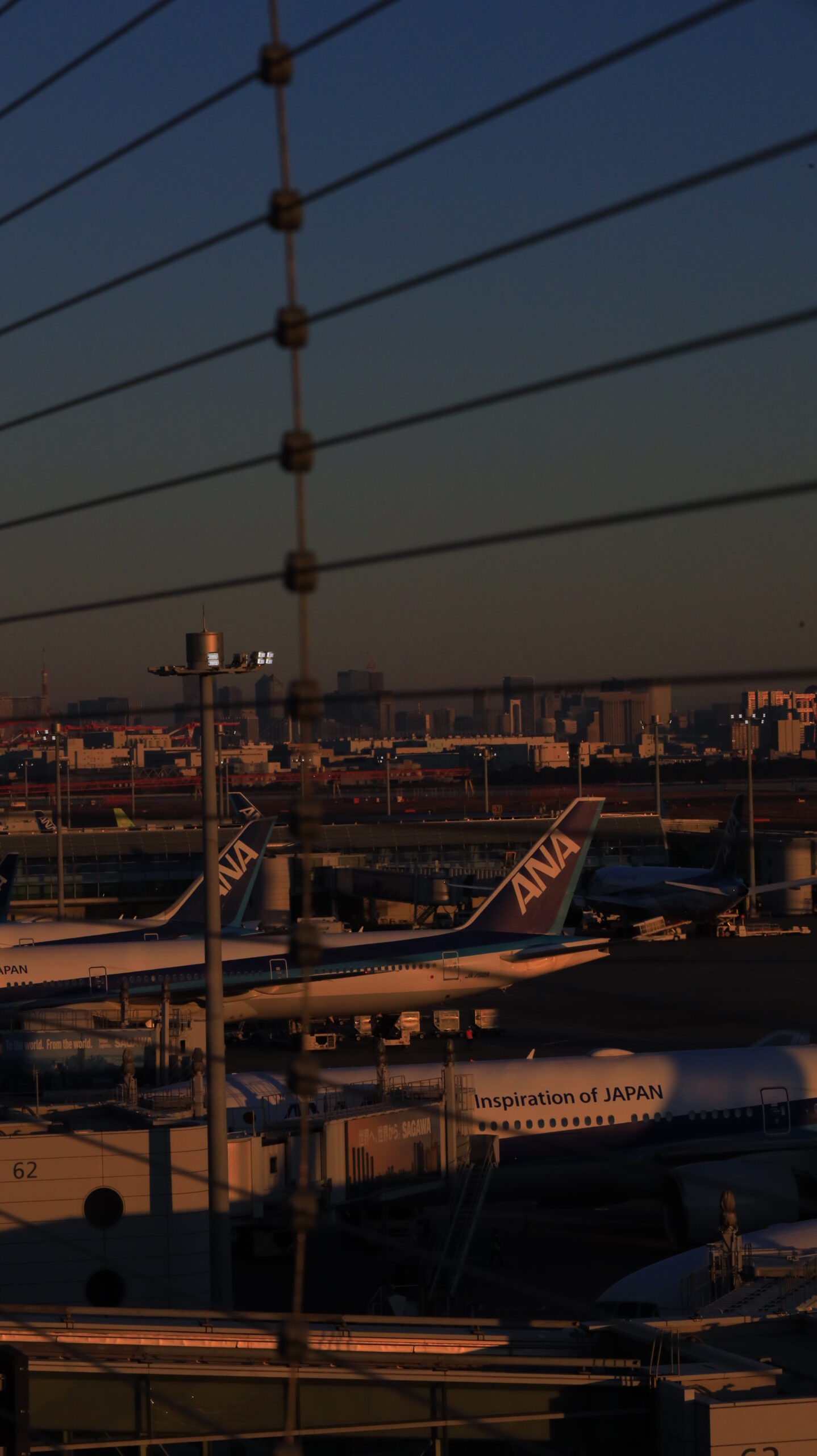 この写真は、羽田空港 第2ターミナル 5F展望デッキで、網越しに飛行機と遠くのビルディングの様子を撮影したものです。現地の視界に近い雰囲気です。