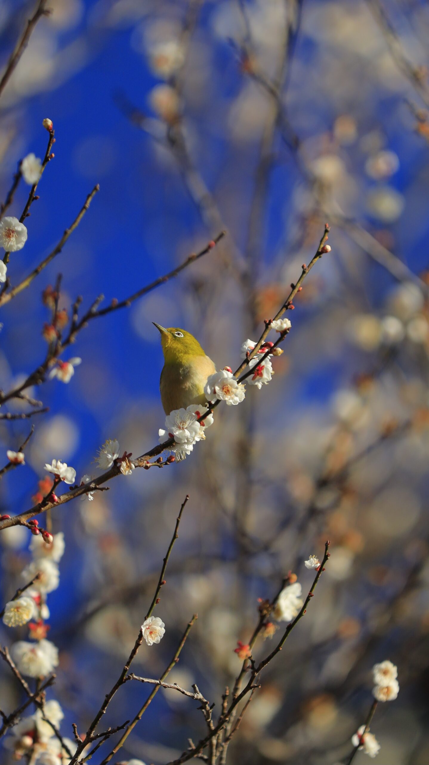 この写真は、熱海梅園で、下から見上げる構図で、梅の花の上にいるメジロの姿を捉えたものです。