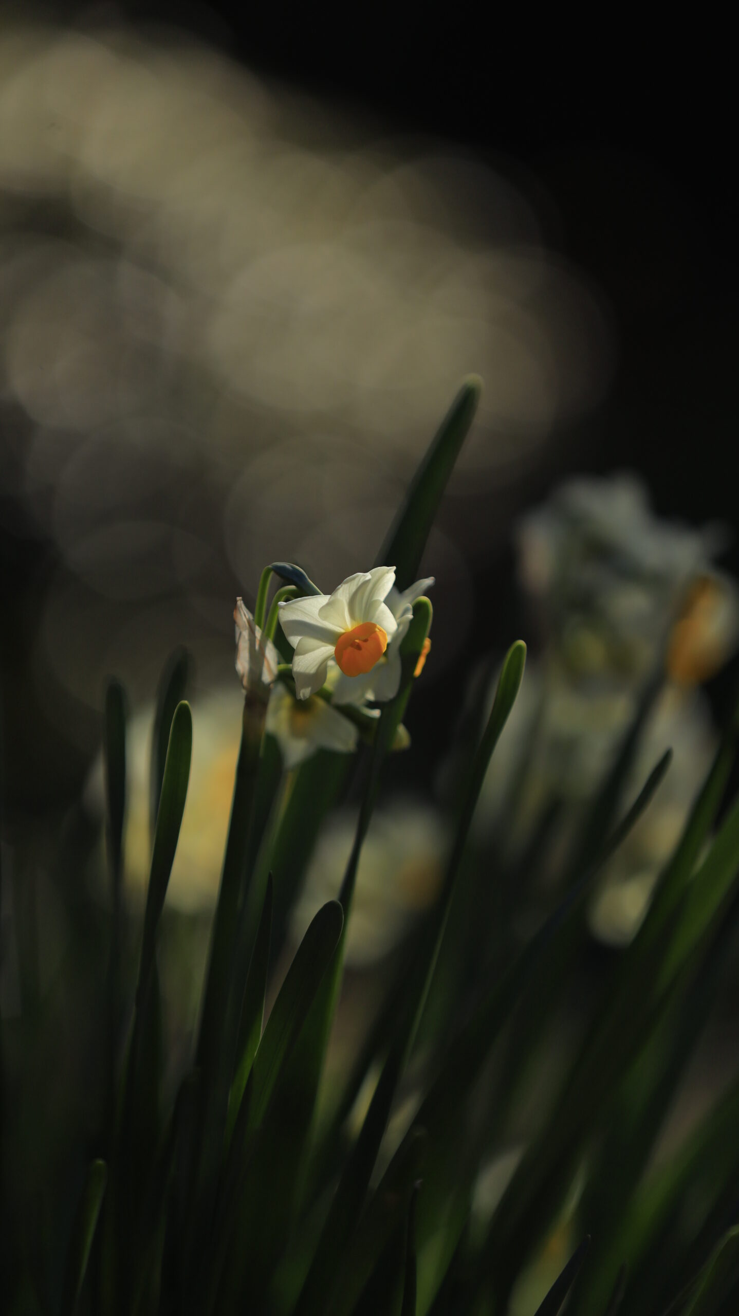 熱海梅園で、薄暗い中で後ろの光を活かし水仙の花が少し寂しげに見える様子を撮影した写真です。