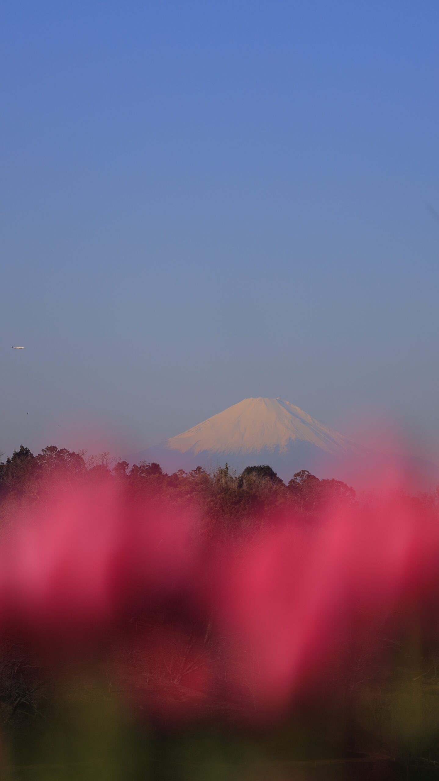 この写真は、東京ドイツ村で、ピンクのアイスチューリップ越しにうっすらと見える富士山を撮影したものです。花と遠景の組み合わせを意識した一枚です。