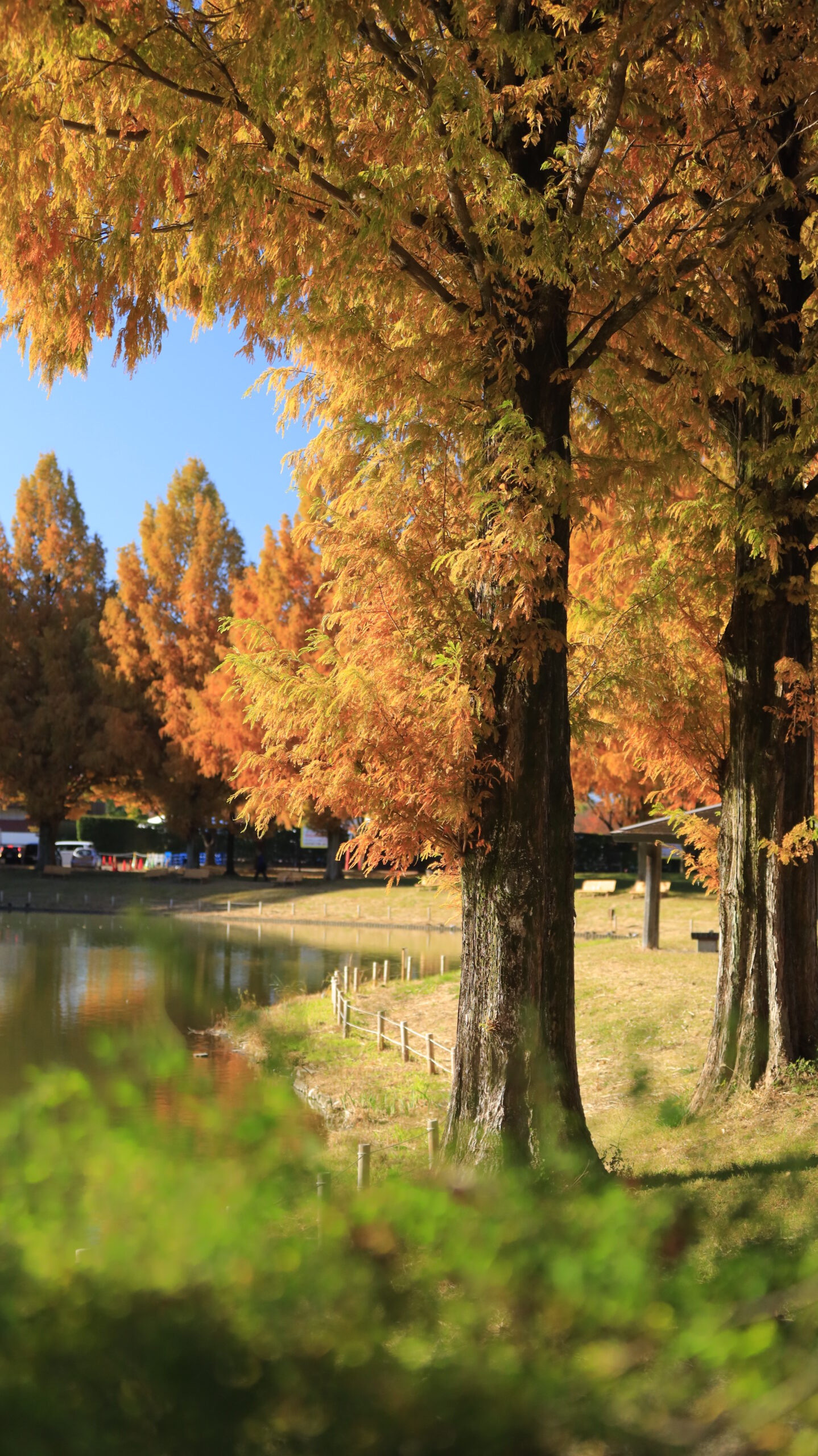 この写真は、川越水上公園で背の低い木の下からメタセコイア並木を覗くように撮影したもので、自然のフレーム効果を活かした奥行きある構図が特徴です。