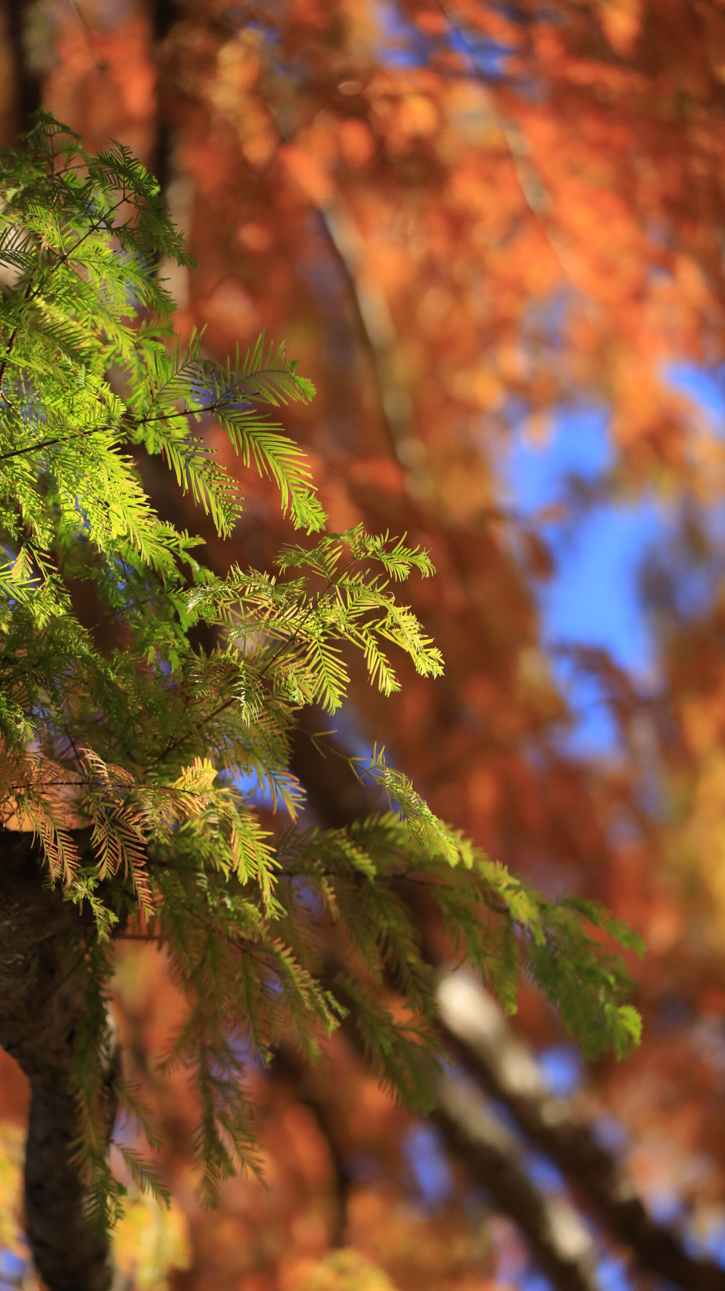 この写真は、川越水上公園で緑色のメタセコイアの葉が茶色い背景の中で際立つように撮影したもので、紅葉の移り変わりを感じられる美しい瞬間を捉えています。