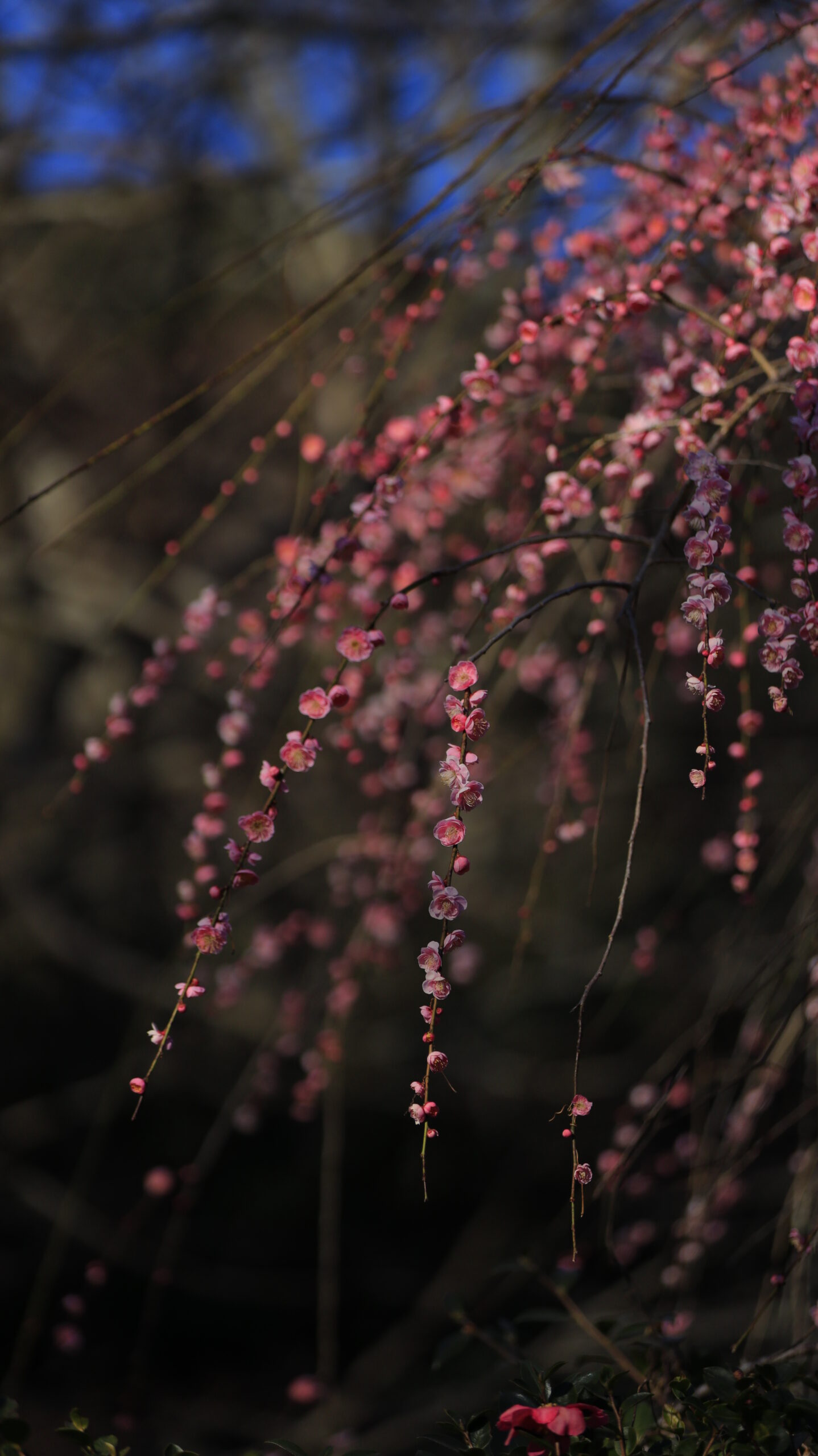 この写真は、熱海梅園で、咲き始めの枝垂れ梅を少し暗めに仕上げ、落ち着いた雰囲気で撮影したものです。