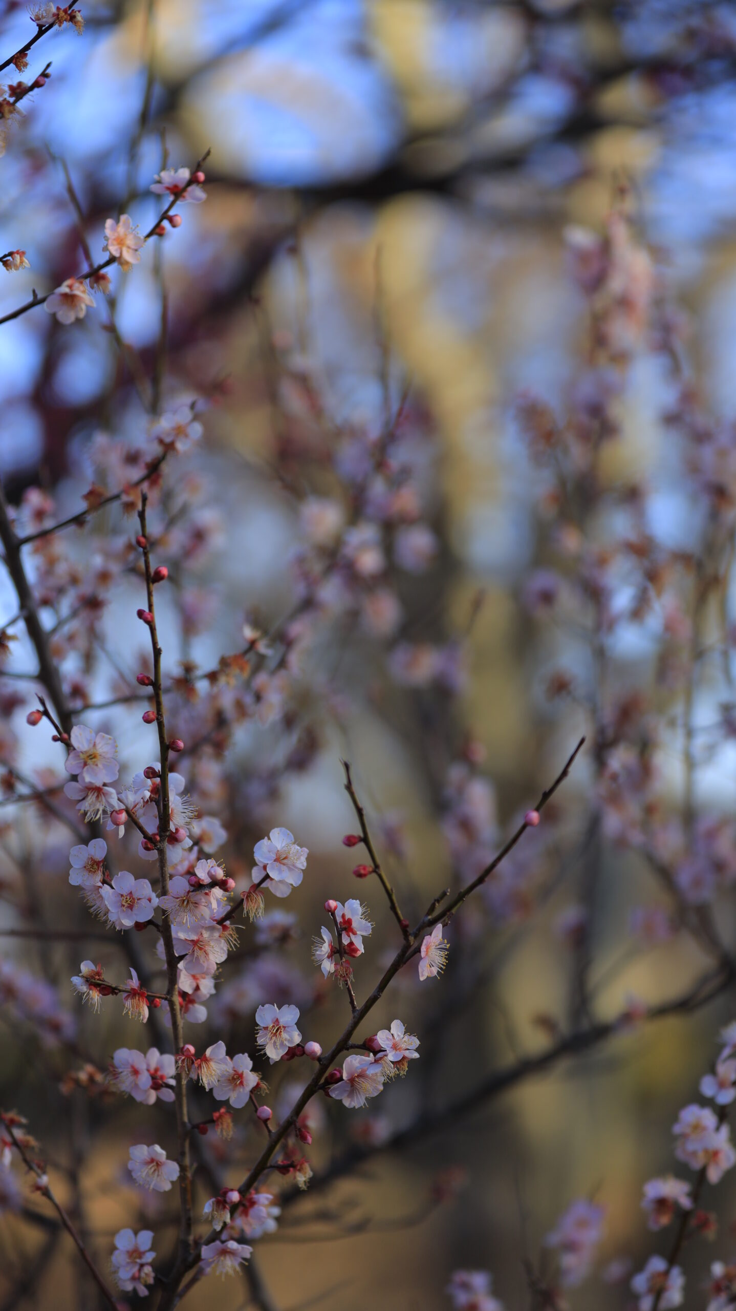 この写真は、大宮第二公園で、梅の枝にわずかに光が差し込む瞬間を撮影したものです。