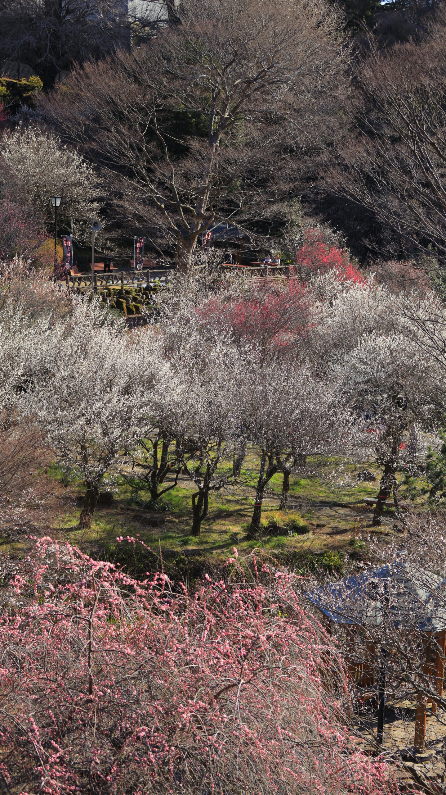 この写真は、熱海梅園で、見下ろす構図で紅白の梅の木々をまとめて撮影したものです。