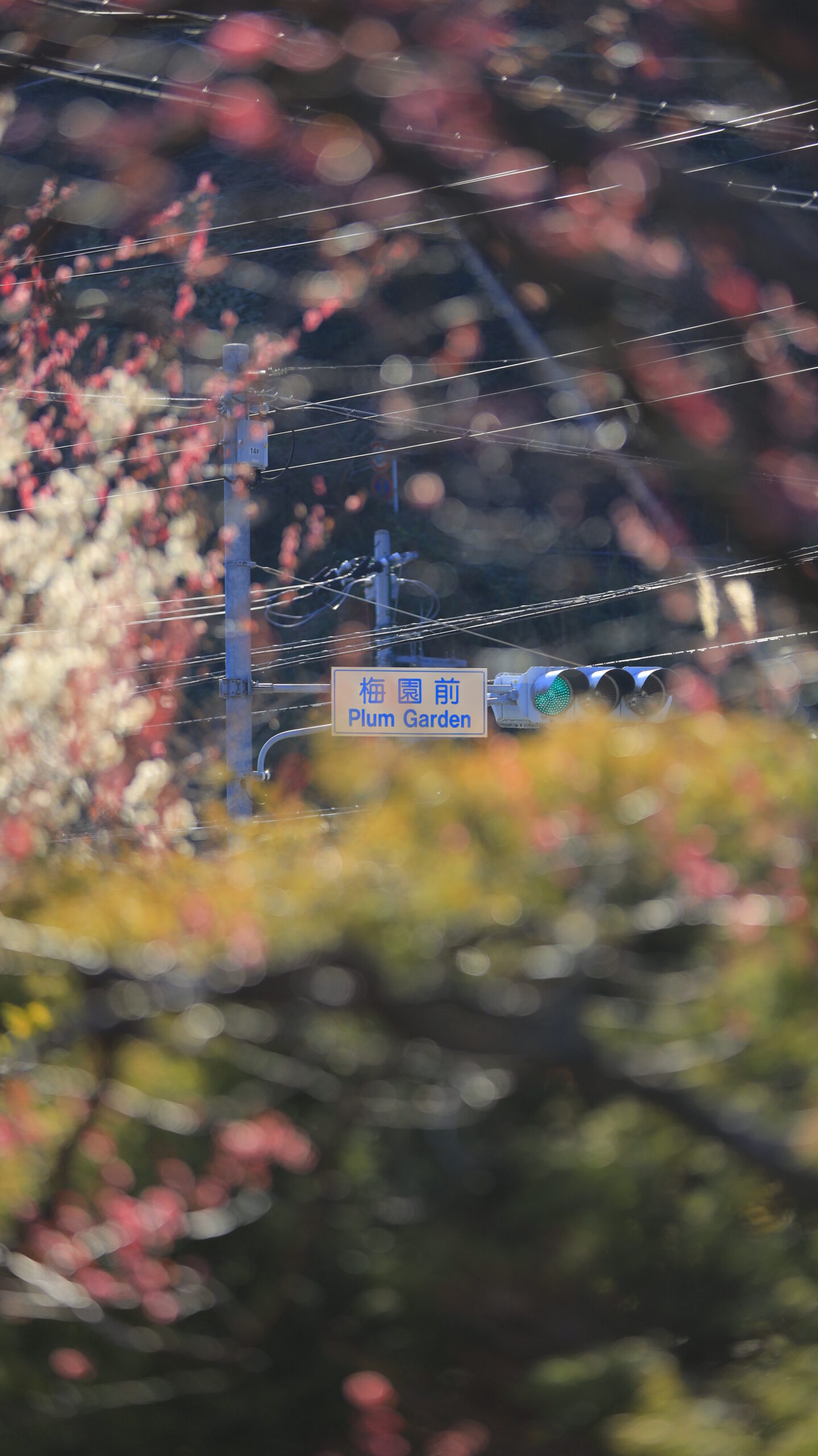 この写真は、熱海梅園で、梅園前の交差点の青信号と梅の花を対比させて撮影したものです。