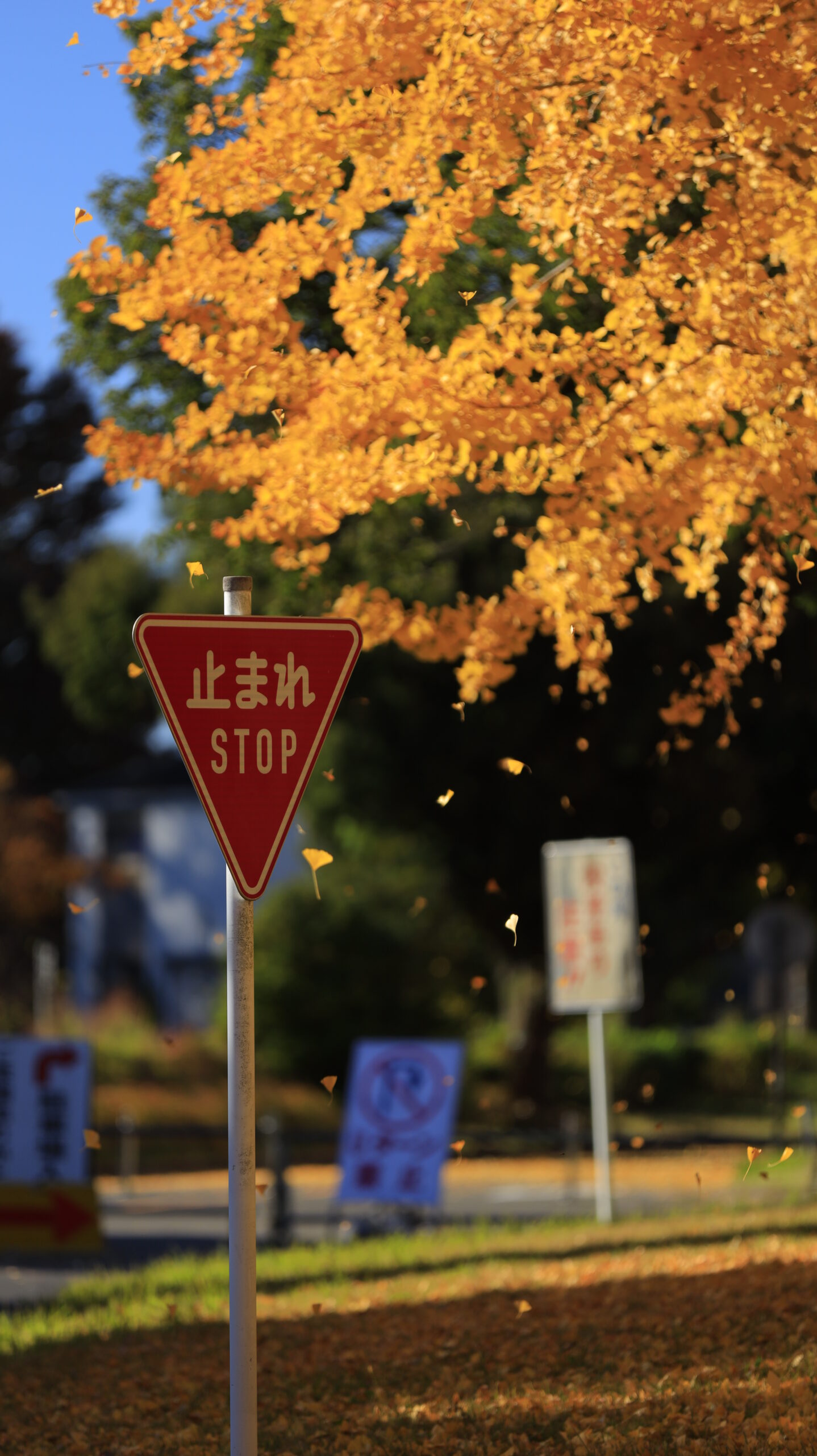 この写真は、川越水上公園で銀杏の葉が舞い散る瞬間を撮影したもので、動きのある秋の風景をドラマチックに表現しています。